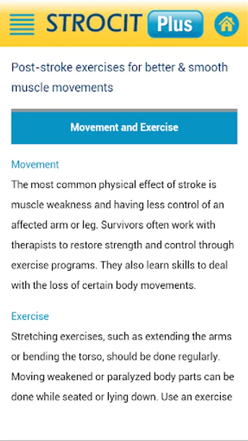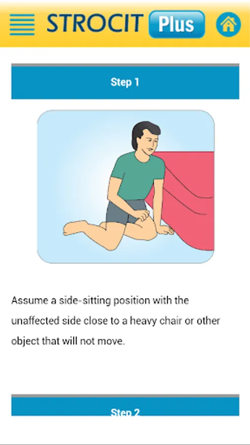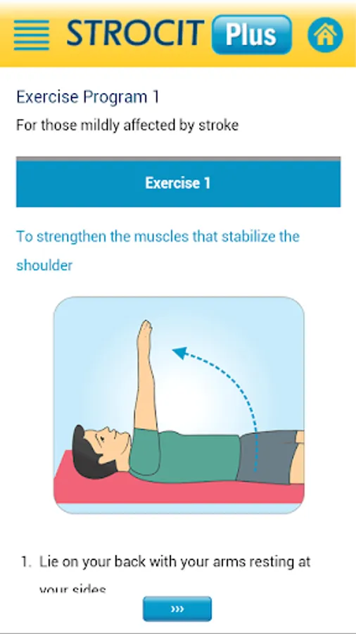 There are two exercise programs illustrated in the apps. The first is for the person whose physical abilities have been mildly affected by the stroke. The second is for those with greater limitations. If you are not sure which one is appropriate, consult the profile that precedes each program.