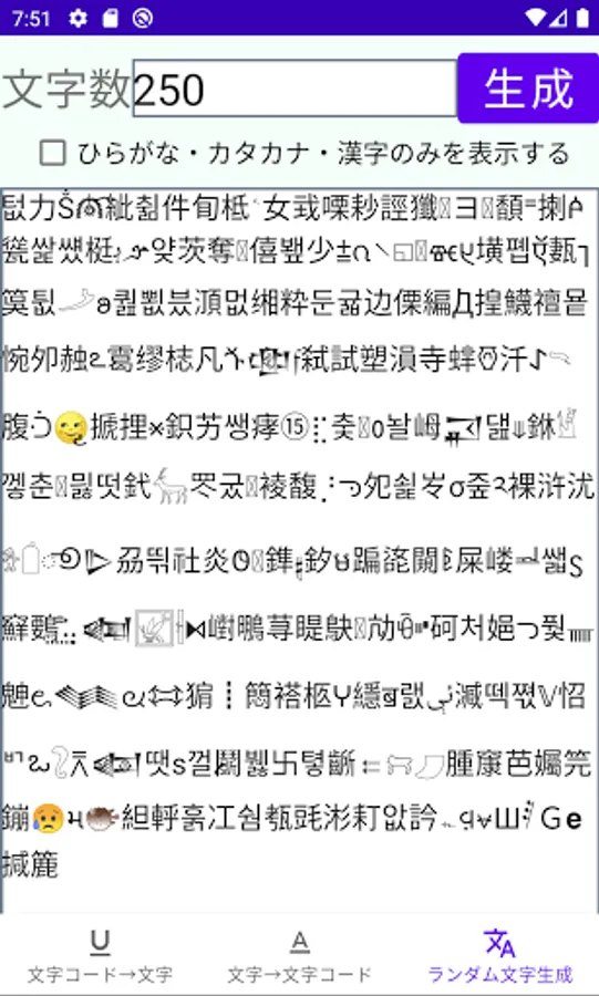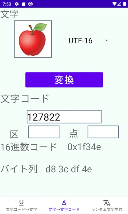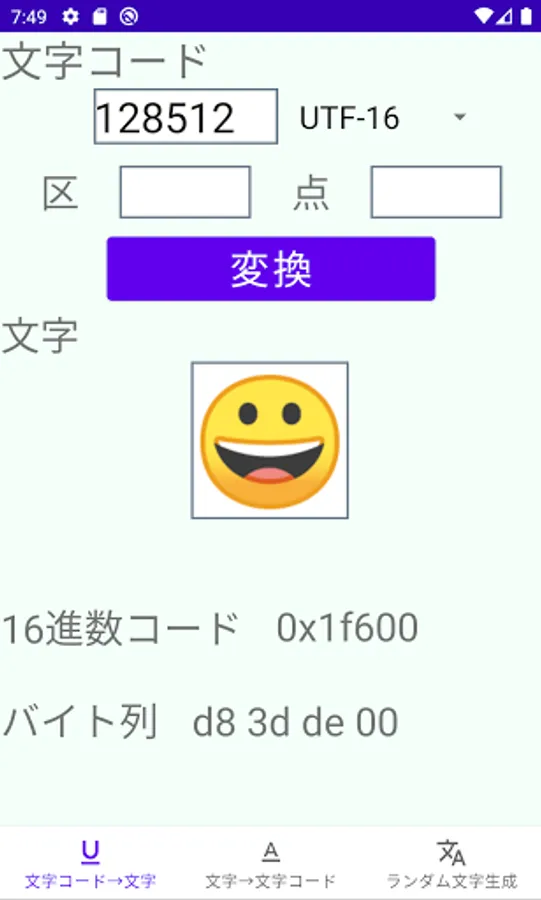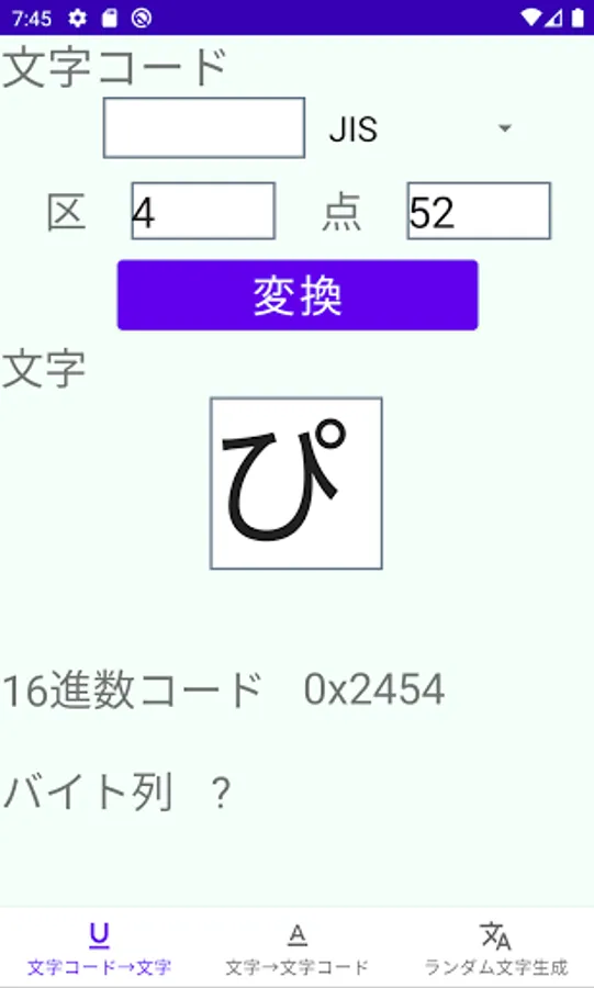 Generates one character from all four types of character codes (UTF-16, UTF-8, JIS, Shift_JIS).