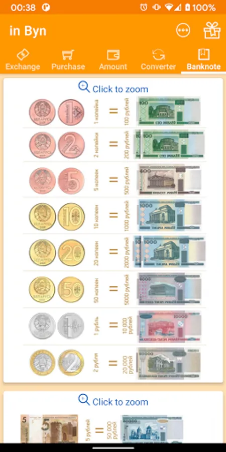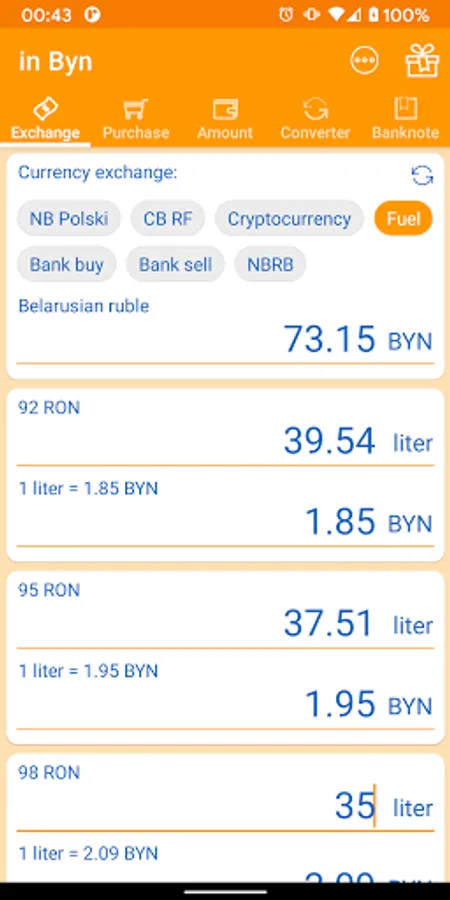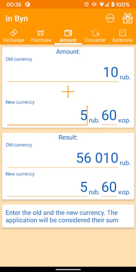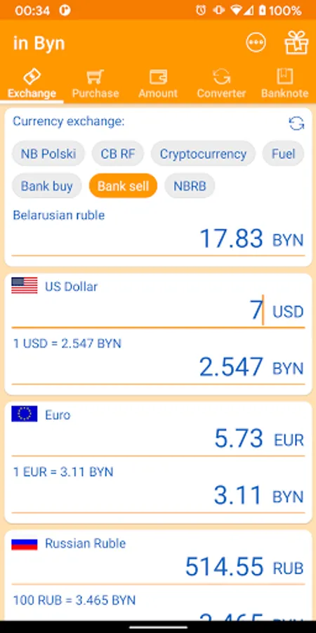 in Byn app will help you easily convert Belarusian rubles into currency and vice versa. It is useful if you are standing in the bank and thinking how many currency to buy and are tired of calculations.