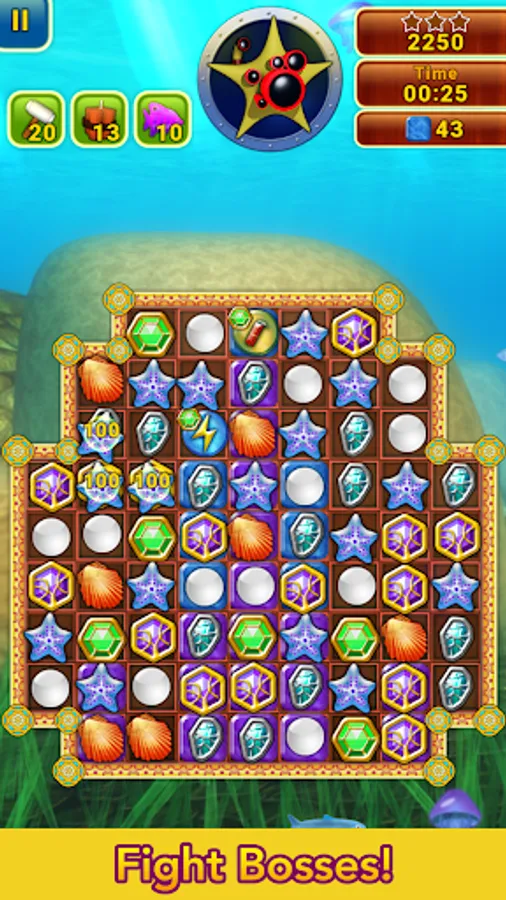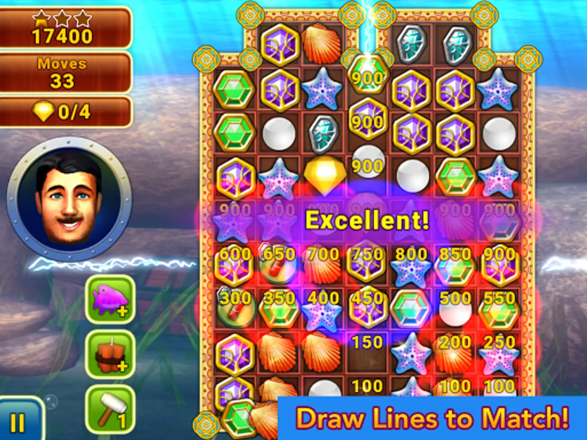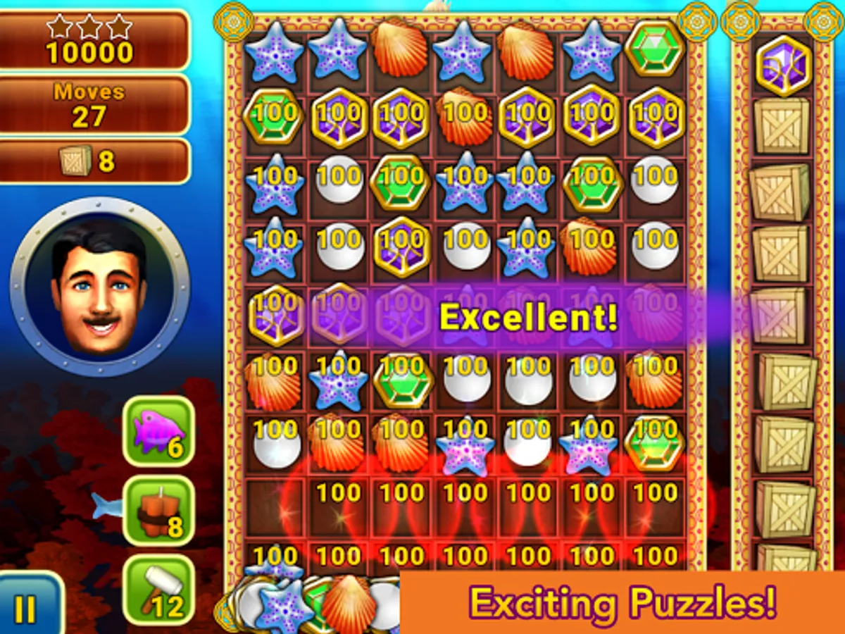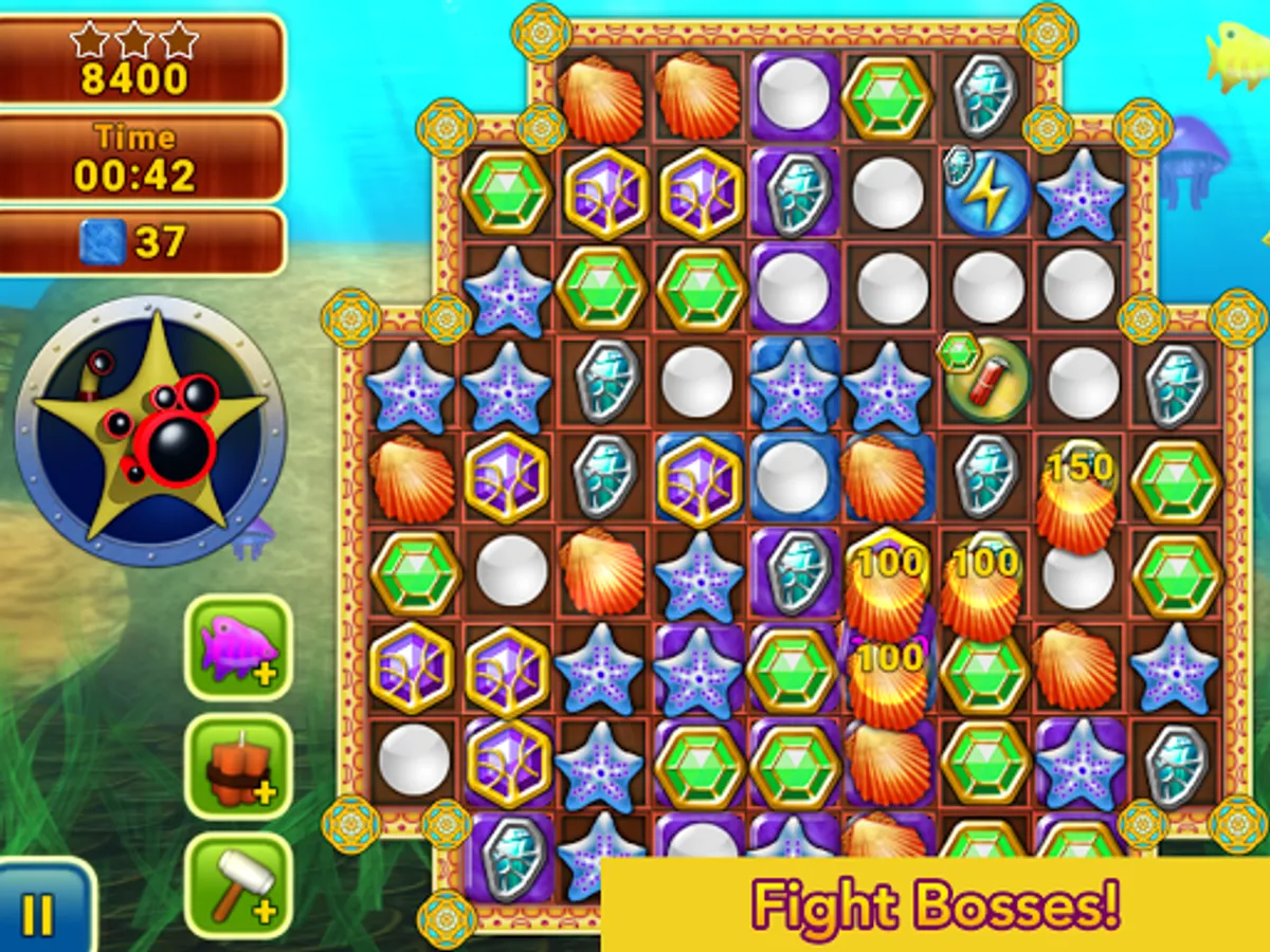 Step onboard the big submarine and wander the ocean. Collect hidden objects and treasures to destroy matching groups of three or more jewels. Acquire power-ups like Bomb and Lightning to improve your score. As a bonus, there's a brave captain to help you navigate the game. Explore the depths of the ocean in OceanuX, an underwater match-3 game.