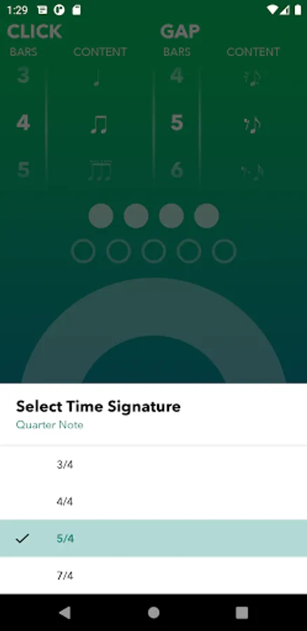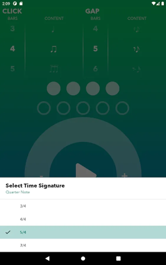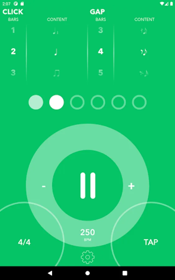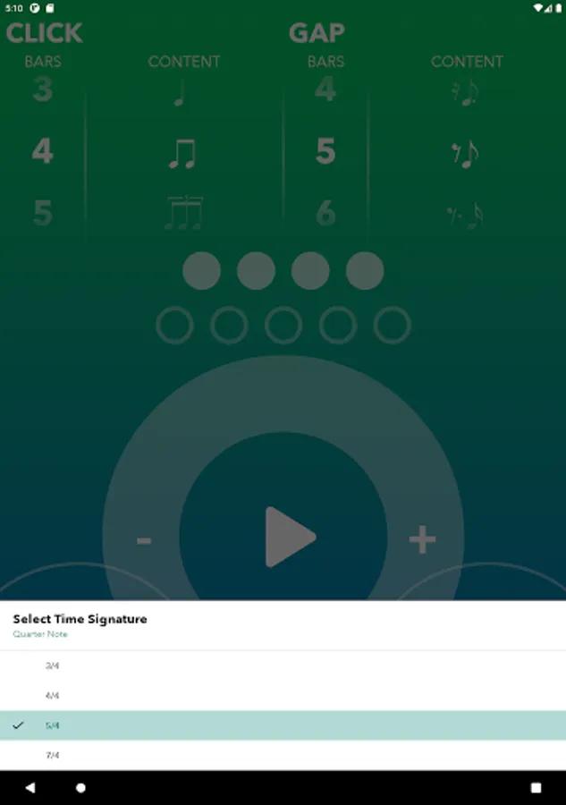 Next you can experiment with all kinds of off-beat patterns in the Gap Bar which moves the click from the downbeat position to a different location. Can you still play your instrument and maintain the downbeat internally even when you hear the click sound on an off-beat?