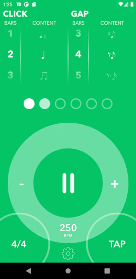 By scrolling through the numbers of bars and patterns you can quickly configure a “gap” of time in which the metronome drops out. When the “one” comes back around, will your playing still be in time? How long of a gap can you play through and still maintain solid tempo?