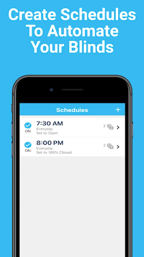 Create schedules that automatically tilt your blinds open and close. Wake up to natural light in the morning and close at night for privacy. You can even make it look like someone is home when you are away for vacation or business.