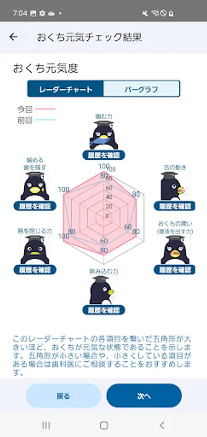 The results of the questionnaire and pronunciation check are scored and radar charted, allowing you to check the health of your mouth.