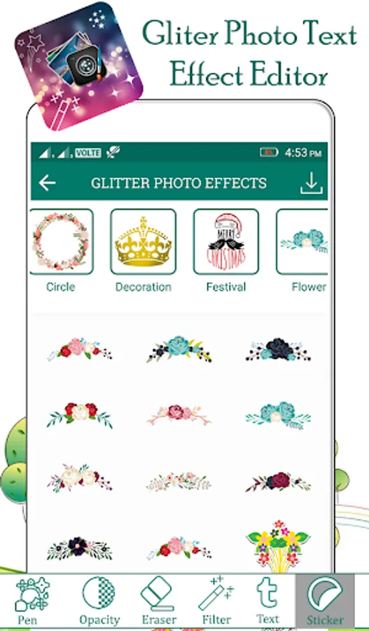 Photo Glitter Effects provides hand draw effects feature. Just select the picture and hand draw effects on the picture from multiple glitter dust effect patterns.