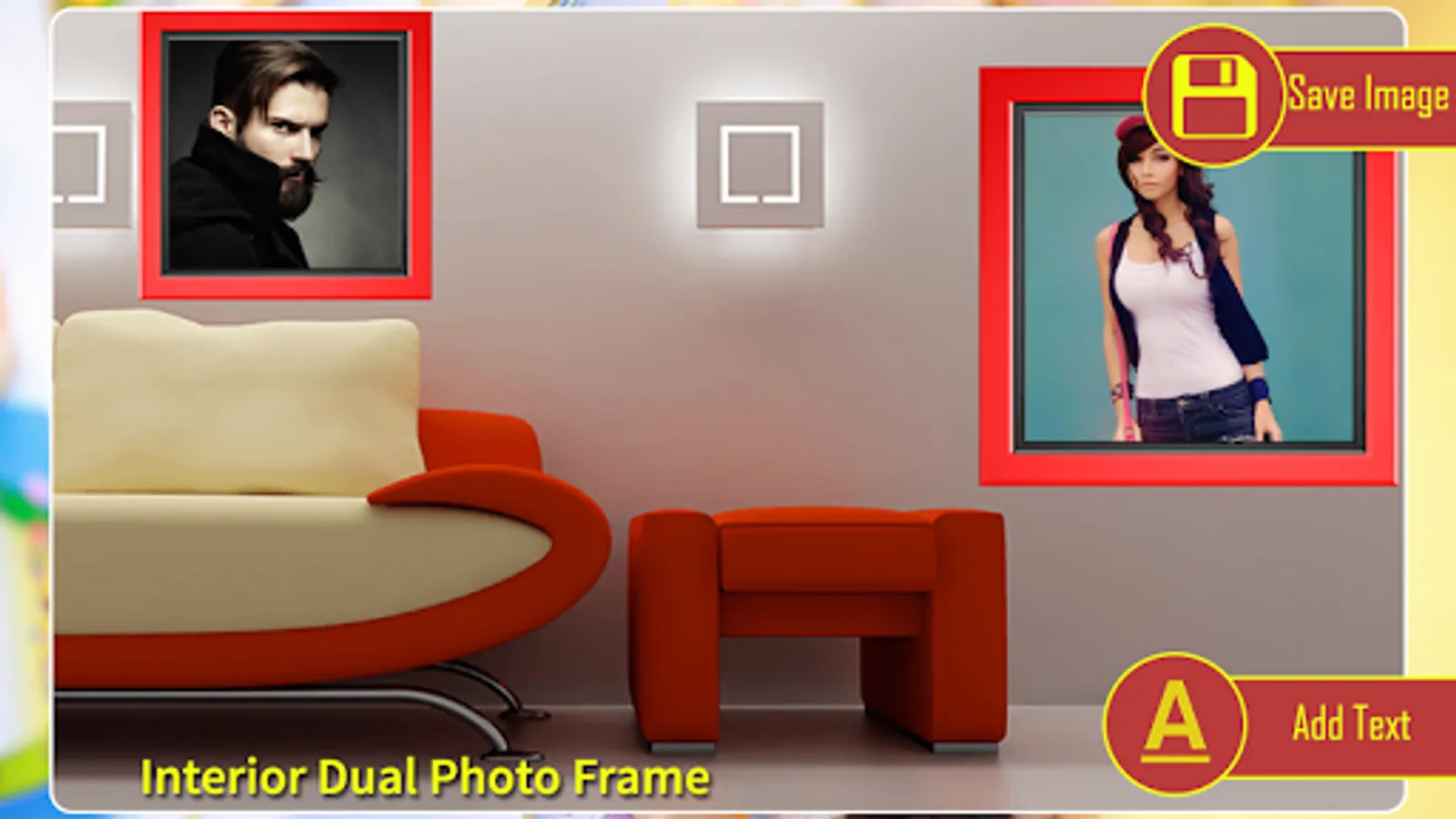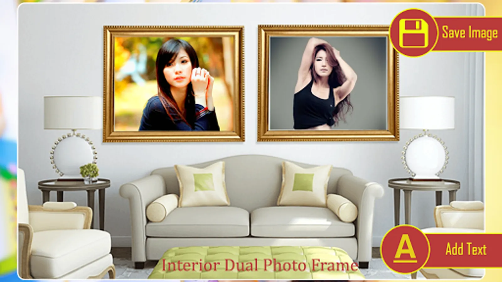 "Interior Dual Photo Frame" is a collection of over many double Photo frames, Stickers and Boarders. We can add the text also with customized fonts and colors.