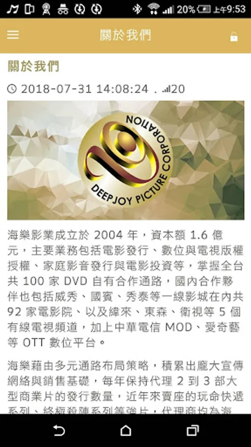 海樂影業成立於 2004 年,資本額 1.6 億元,主要業務包括電影發行、數位與電視版權授權、家庭影音發行與電影投資等,掌握全台共 100 家 DVD 自有合作通路,國內合作夥伴也包括威秀、國賓、秀泰等一線影城在內共 92 家電影院、以及緯來、東森、衛視等 5 個有線電視頻道,加上中華電信 MOD、愛奇藝等 OTT 數位平台。