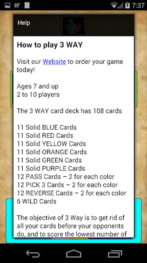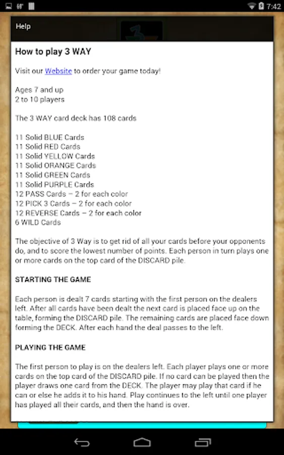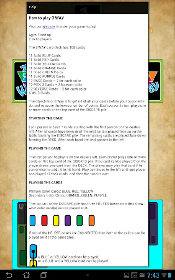 The 3Way card game is for family fun time. It is easily played by small children and adults. It's a unique color matching game with a double deck of 108 cards.