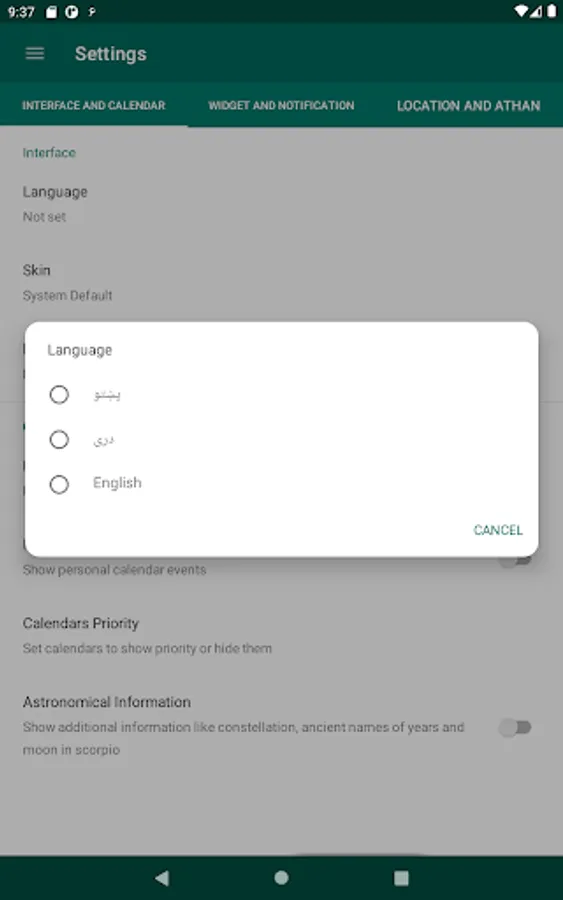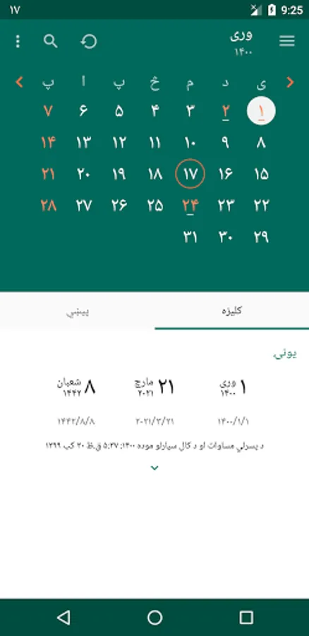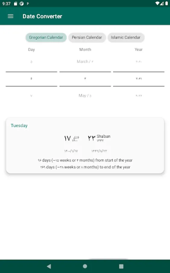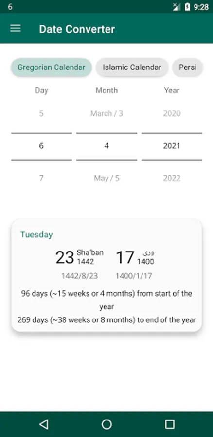 One of the core features of the application is to convert between dates: From Islamic to Gregorian, from Afghan date to Gregorian, from Afghan to Islamic, and vice versa.