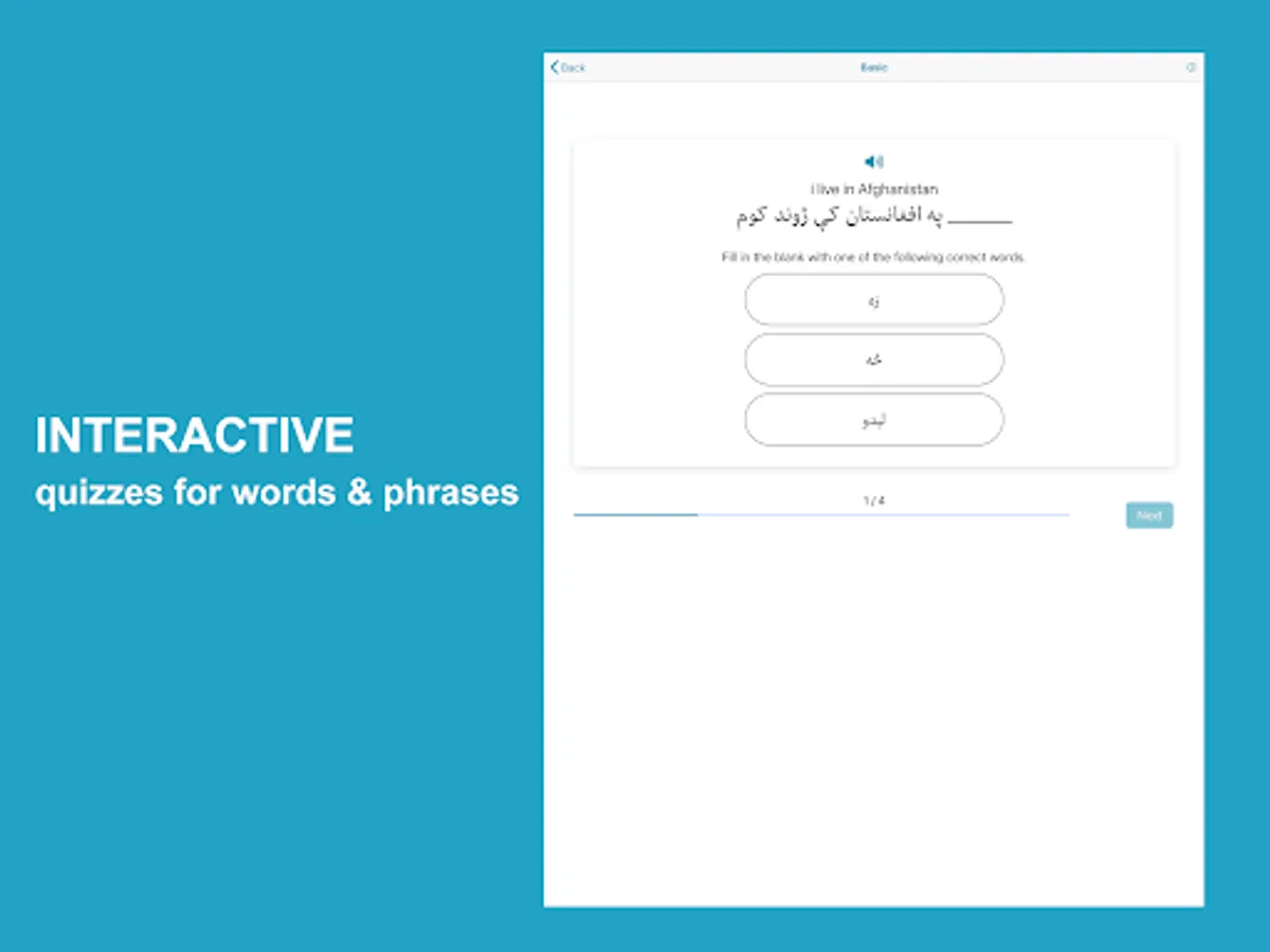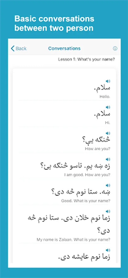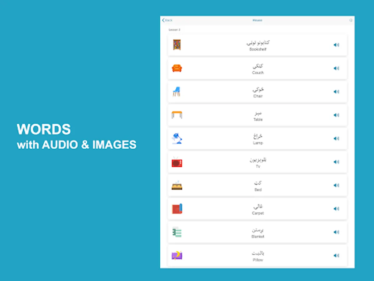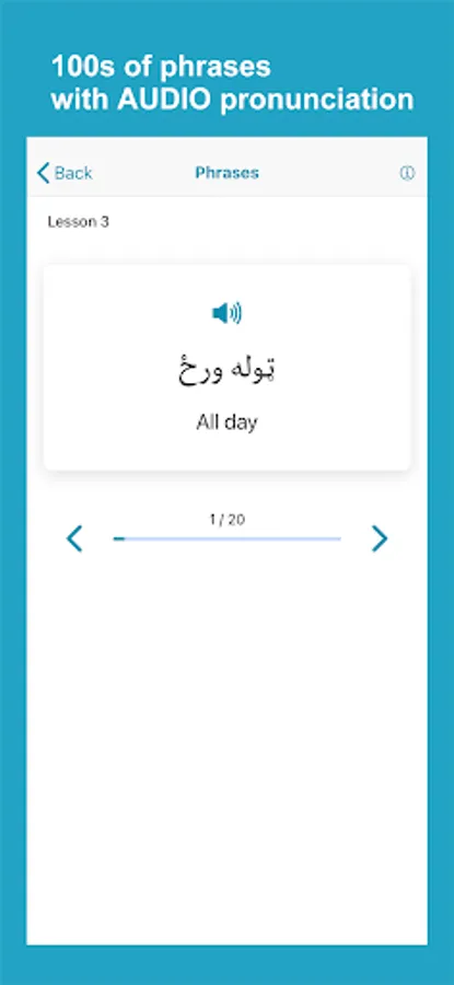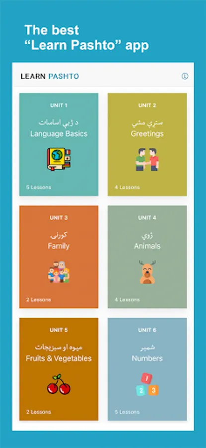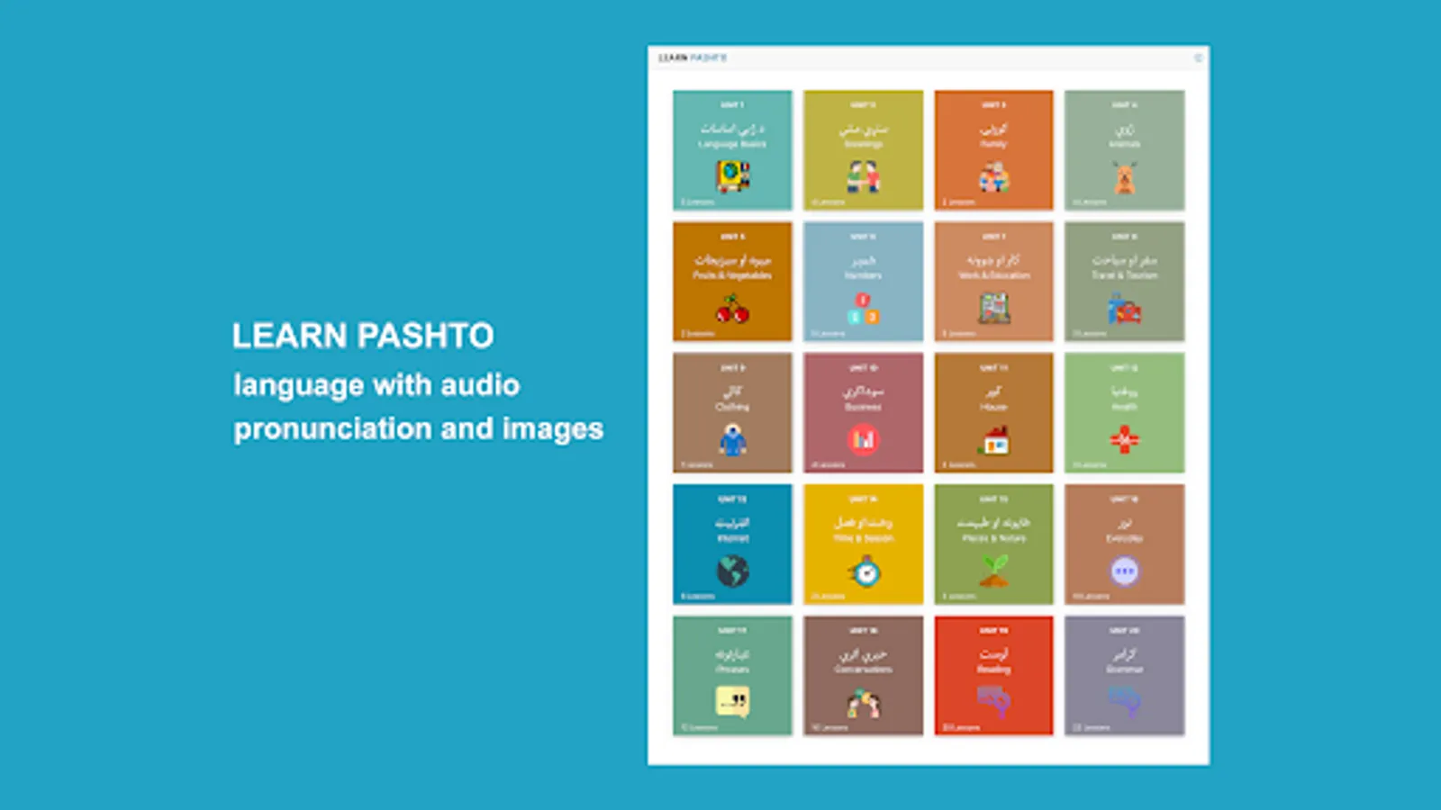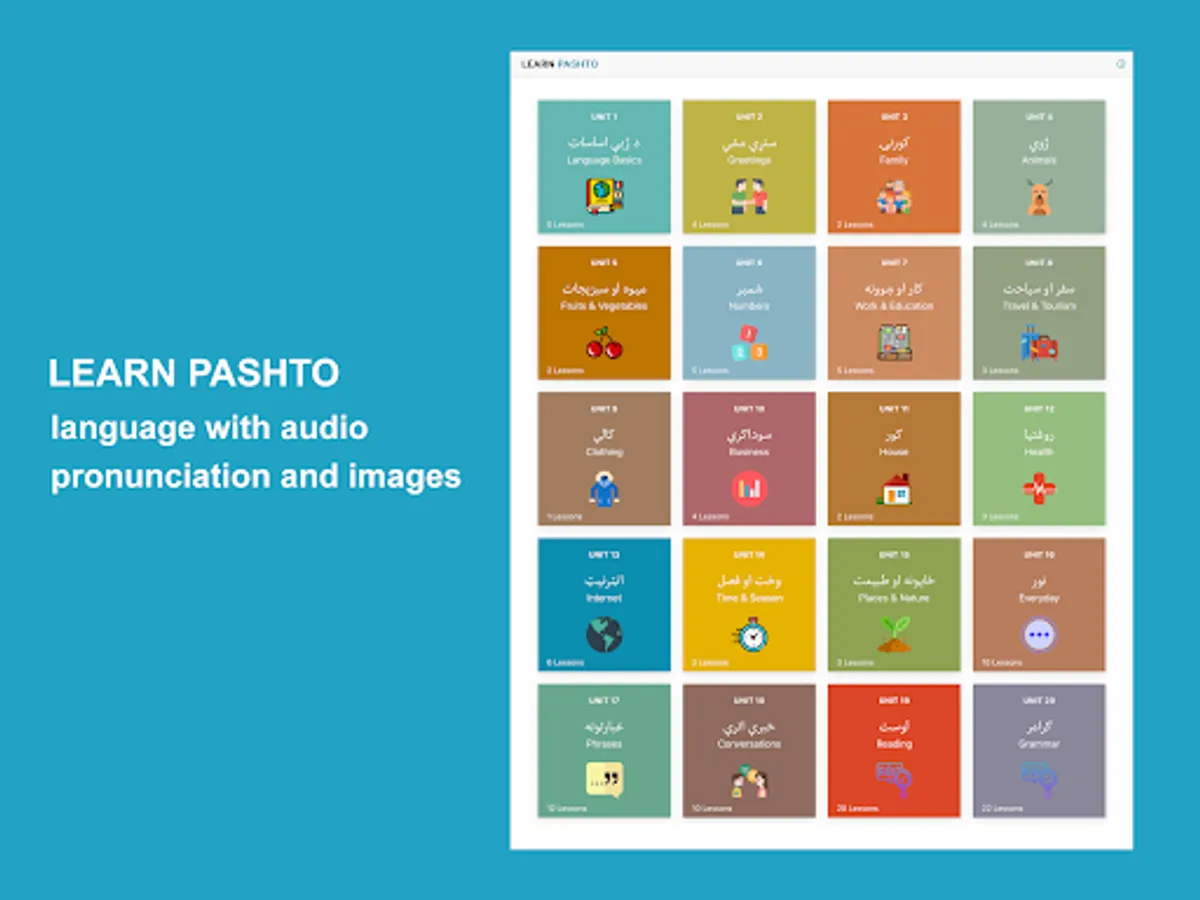 Learn Pashto application helps non-Pashto and Pashto speakers learn and improve Pashto language skills. The app has complete materials to help you learn fast and accurately. The app divides lessons into words, phrases, conversations, alphabet, numbers, reading, grammar, and quizzes with Pashto audio pronunciation and images for each word.