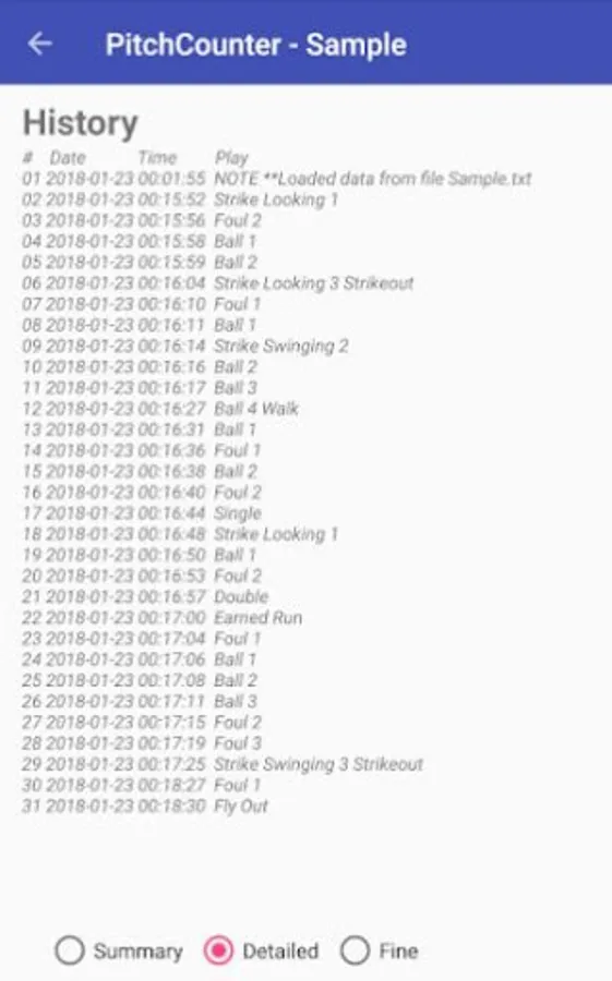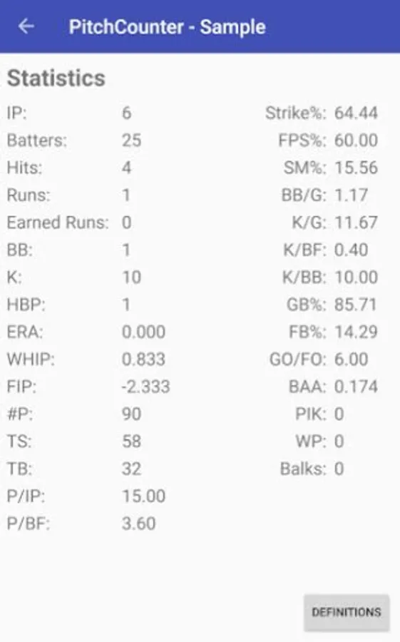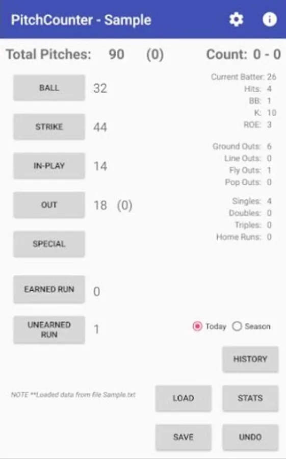 This Pitching Counter application will allow you to track every pitch of a baseball (or softball) game by each pitcher. The intention is to track the performance of a pitcher over a game, or a season. 41 different pitching statistics are calculated using the tracked data.