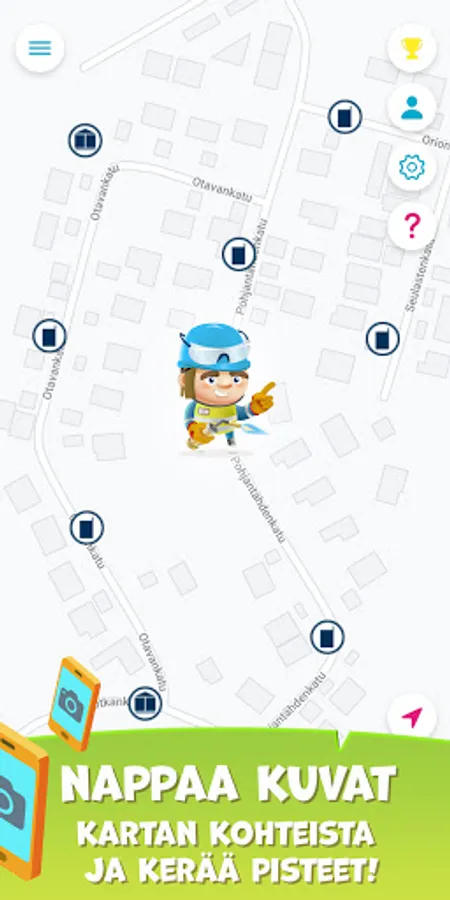 The character you select in the game shows your location on the map. All objects to be photographed, Elenia's transformers and distribution cabinets, appear on the map as symbols near your character. There are objects to be photographed all over Elenia's domain from Hailuoto to Karkkila and from Seinäjoki to Laukaa.