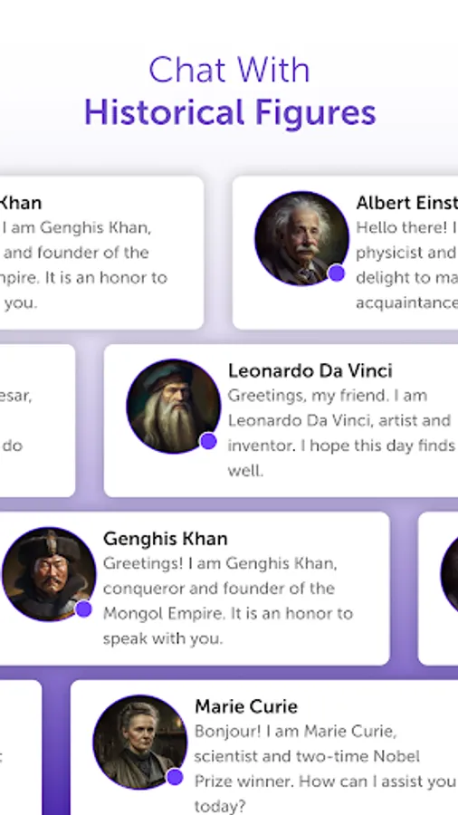 Unleash your creativity by designing unique characters with distinct personalities, all powered by our advanced AI technology. From imaginary companions for an adventurous journey to digital clones of popular figures from media and history, your imagination is the only limit.
