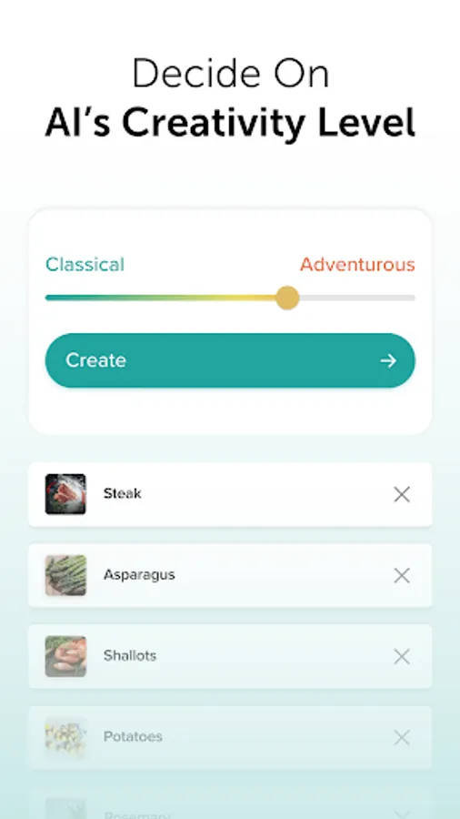 Create delicious recipes by just entering ingredients and adjusting the adventurousness level of your choice! Our AI will generate a complete recipe with step by step instructions of how to cook using that recipe.