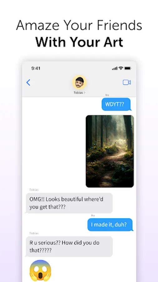 With Imagina, creating art has never been easier. Simply enter a description of what you want to see, pick an art style from a wide range of options, and let the app do the rest. Create unique and creative images like "Haunted Cornfield" or "Flaming Ocean", or visualize movie characters, star signs, and monuments in a whole new way.