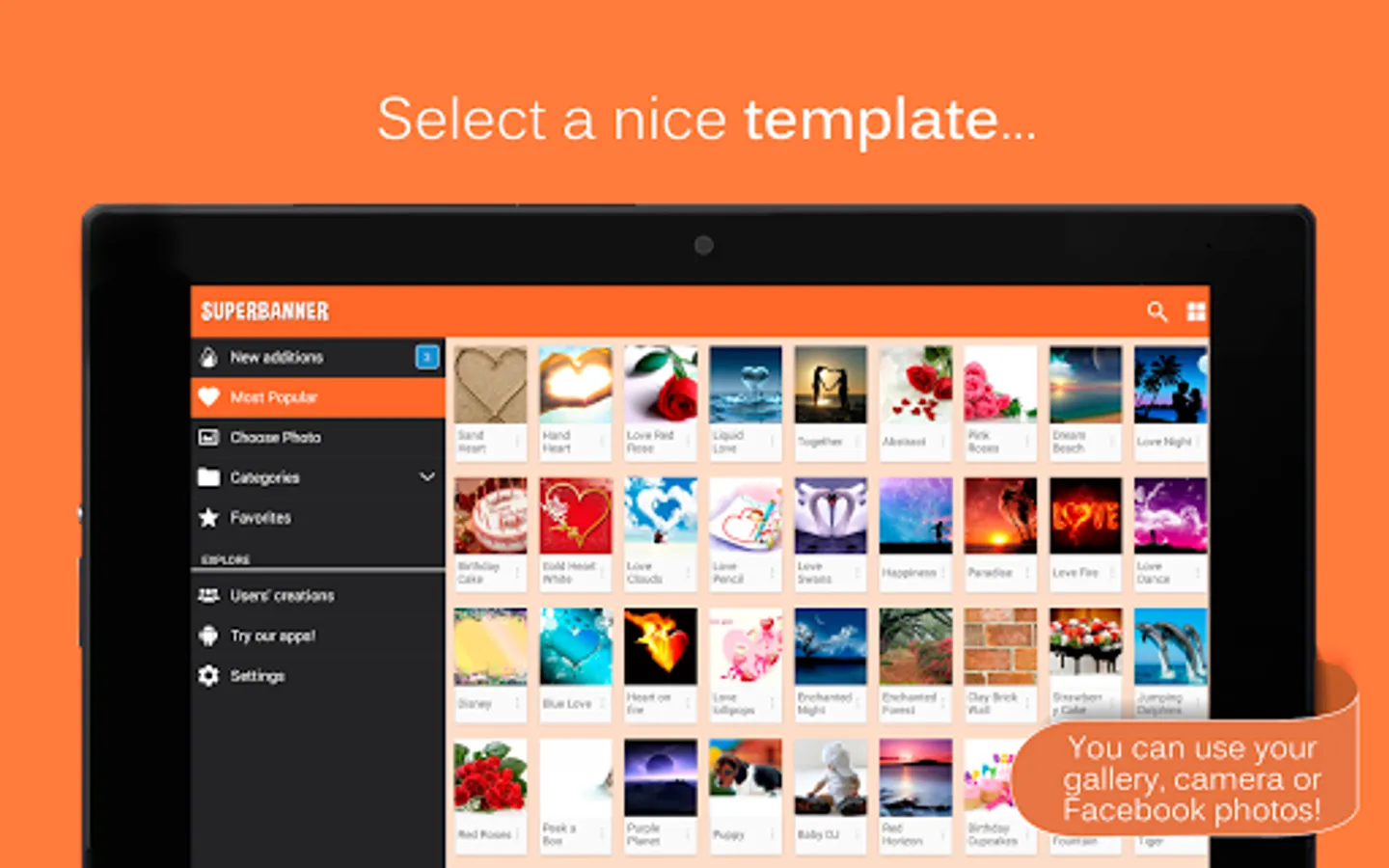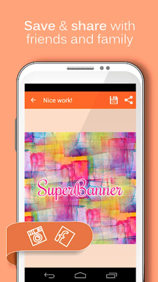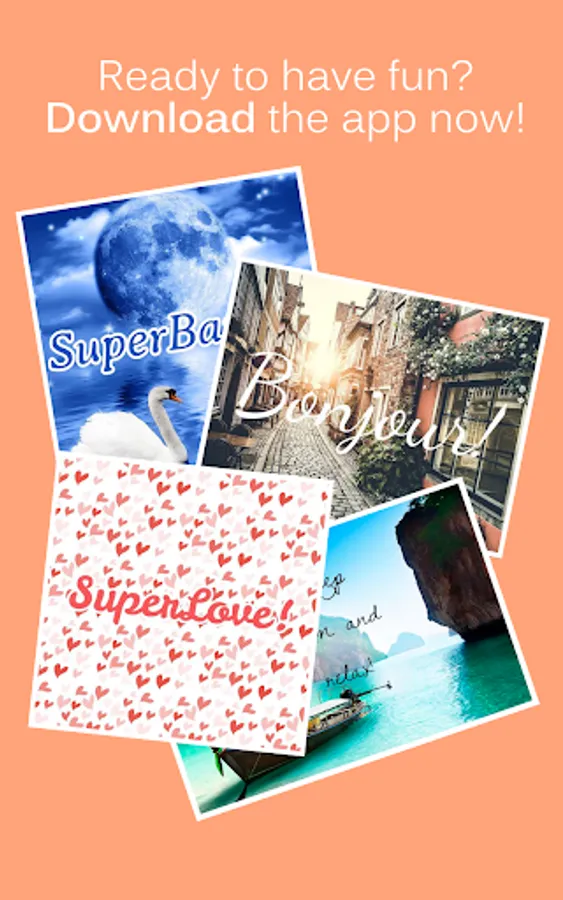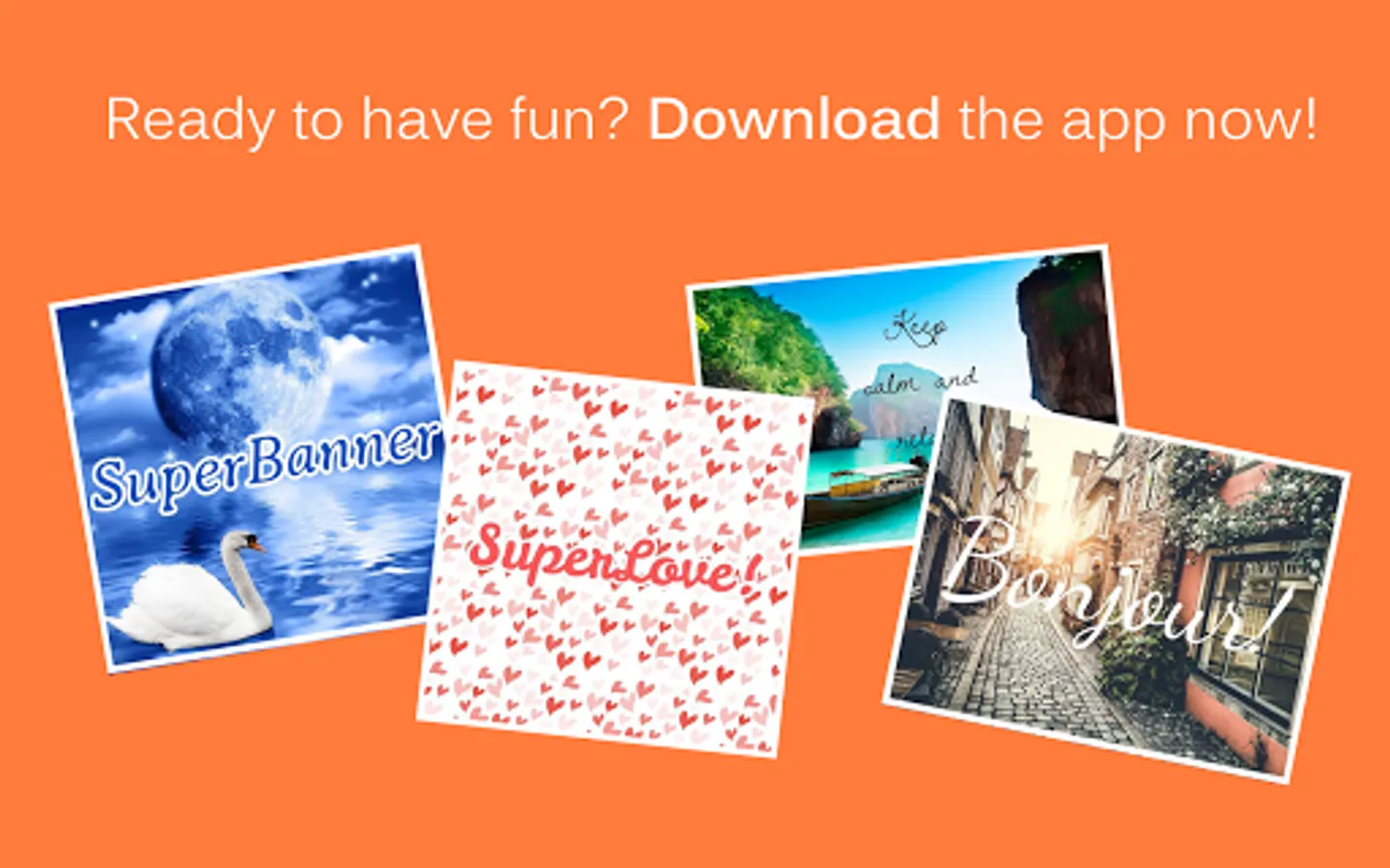 Create beautiful banner messages and immediately share them with your loved ones! Add a message to your best photos or choose among our huge variety of backgrounds and make awesome custom banners to share with your friends! We have thousands of fonts and textures for you!