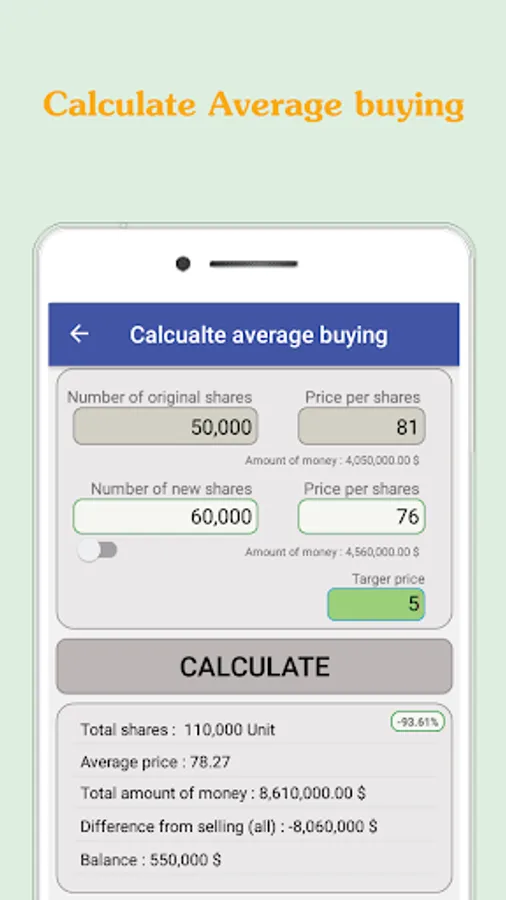 - Calculate from original Stock and newly bought Stocks to find average price per Stock