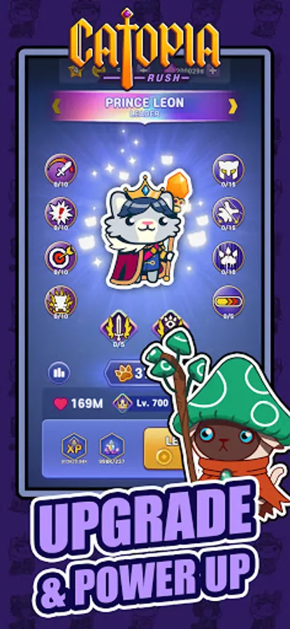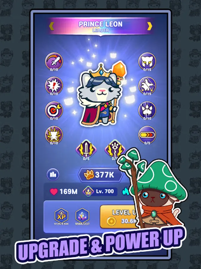 Level up your cats to their full potential! Increase your Cat Power to gain unimaginable power. Hero attack patterns get stronger from leveling with 10 Talent Sets for 100 total upgrades!
