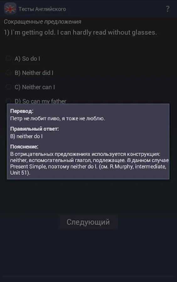 This appendix presents English language tests with answers, translations and explanations. It is intended for teachers of English, applicants, schoolchildren, as well as all those who are preparing to take the test exams in English or want to test their knowledge. Here are collected tasks on vocabulary, grammar, skills of understanding texts in English. Short comments are given for each test. Assignments sorted by topic