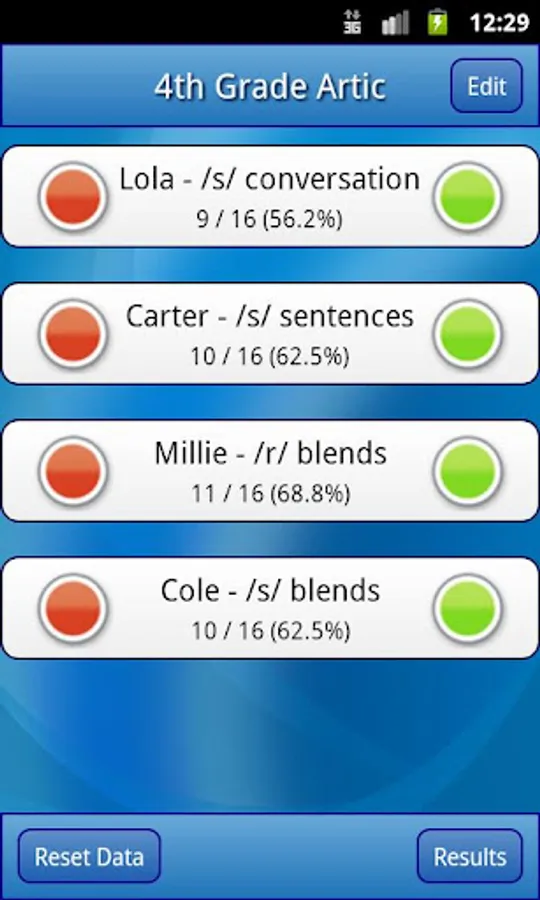 Use the default labels (e.g., “Group 1” or “Player 1”) for quick data collection, or customize the labels by adding a group name, student name, goal, or other information. When you’re ready to begin taking data, simply tap the red or green button to score a student’s response as correct or incorrect. The Data Tracker calculates the percentage of correct responses automatically.
