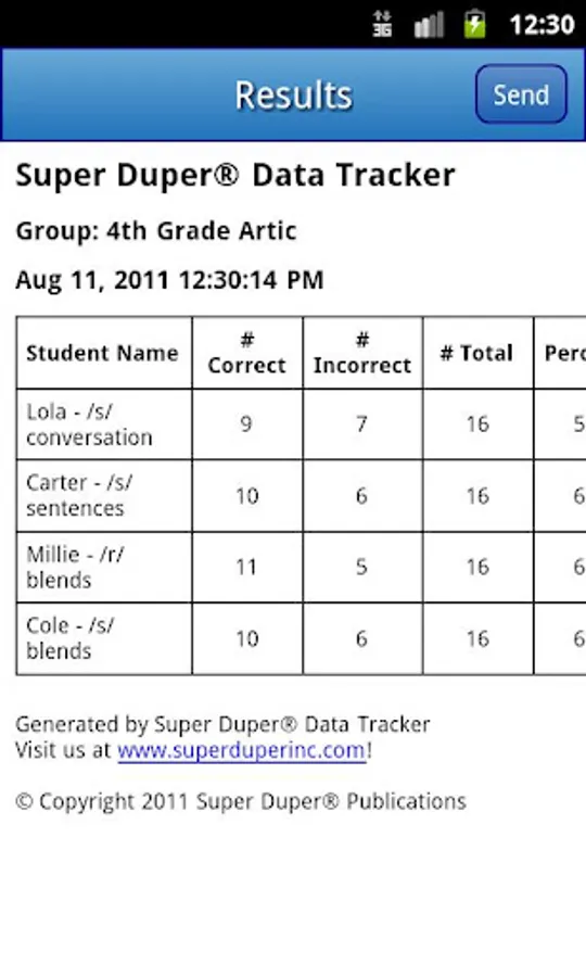 Spend more time treating and less time tracking with this easy to use app! The Super Duper® Data Tracker lets you document and monitor your student’s progress using your Android phone or tablet. Simply organize your students into groups. Then enter your student’s names and even their goals. Track incorrect and correct responses discretely and efficiently.