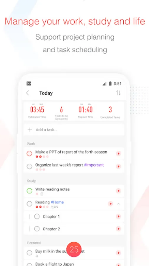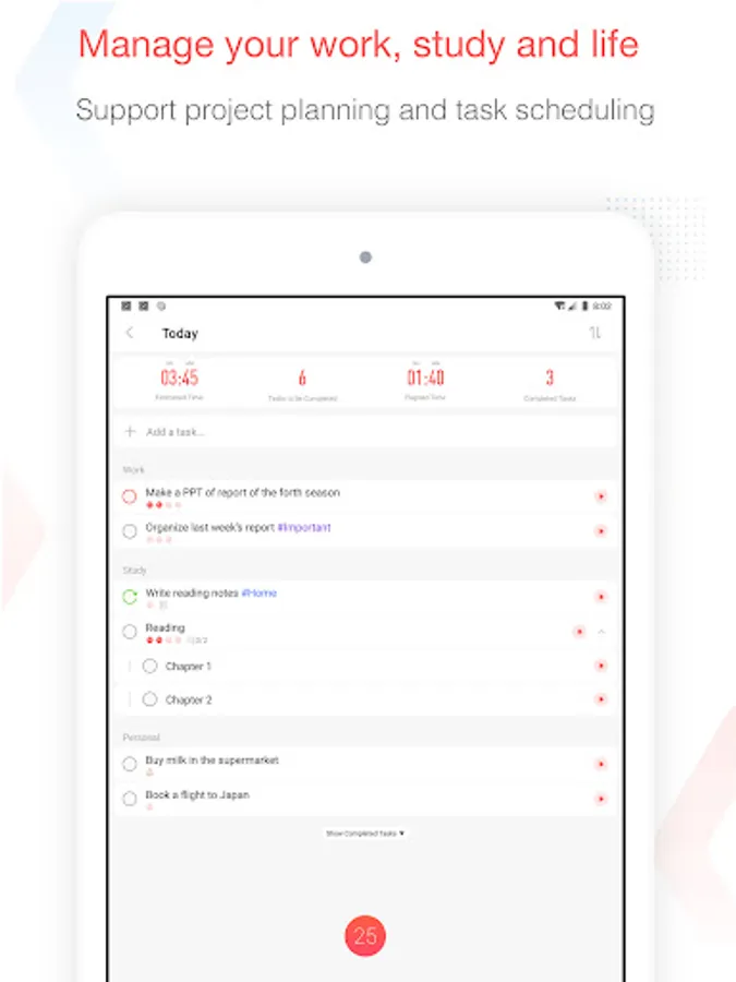 Tasks and projects: Organise your day with Focus To-Do and complete your to do, study, work, homework or housework you need to get done.