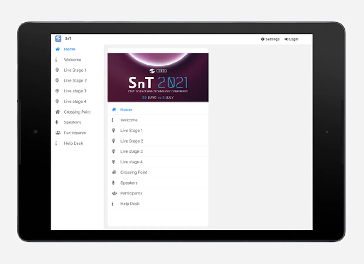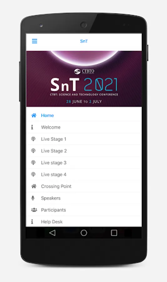 The SnT2021 App provides easy access to relevant information about the CTBT Science and Technology Conference 2021. It contains the list of participants, speaker profiles, programme, abstracts and other useful information related to this particular event. It also includes voting, announcements, social walls and other functions as well as a built-in messaging service which allows participants to communicate with each other.