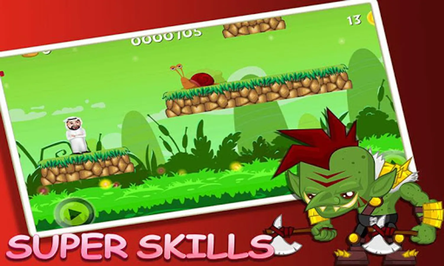 Run, jump, bounce and swing on vines as you help Arabic Prince to outrun a huge scary monster! Run over the turtles, boar or fly with the toucan to overcome dangerous obstacles like massive boulders, crocodiles, piranhas and boiling lava. Nature can be a cruel enemy. Play as Arabic Prince! Super King Fahad! Keep full control with highly responsive single-finger tap and swipe controls.