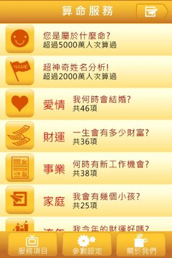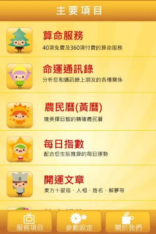 ◎每日指數配合您的生辰推算您當日的財運、愛情、事業等吉凶指數及方位,並告訴您當日的幸運數字、方位、色彩及幸運物,讓您好運旺旺旺。