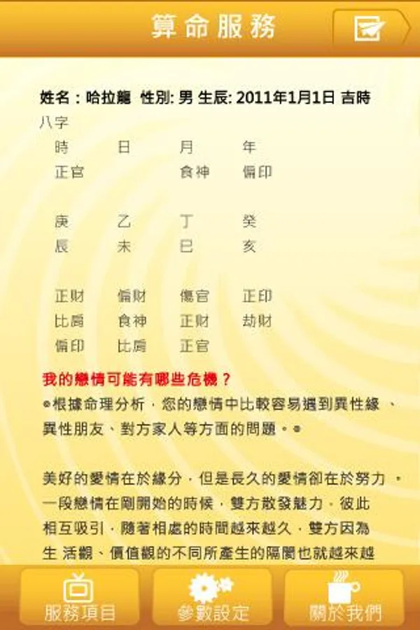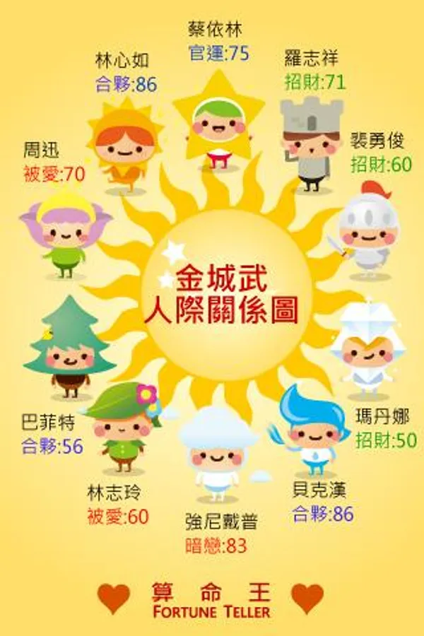 ◎命運通訊錄分析您和通訊錄上朋友的各種關係, 讓您知道誰會愛慕您, 誰和您來電, 誰對您忠誠, 誰會幫您破財, 誰是您的貴人等數十項分析, 還可製作成兩人及多人的命運關係圖讓您上傳Facebook或Email給他人。