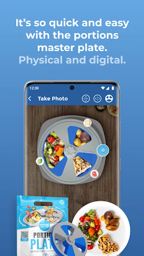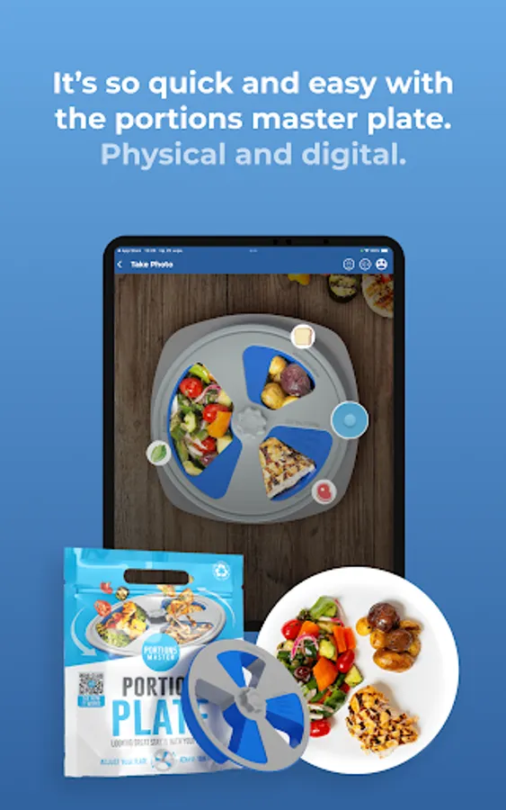 For optimal results, use both the digital plate within the app and the physical Portions Master Plate™ which you can receive for FREE when you become a member.