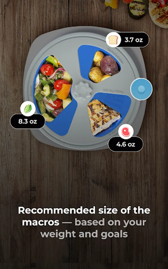- Portions Control Plate: Manage portion sizes for greens, proteins, and carbs. Use the app's digital plate when you're out or get the physical plate and use it at home.