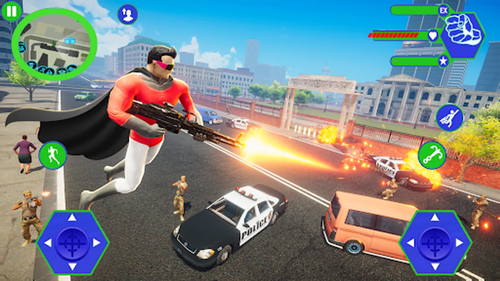• Flying super flame hero warrior against crime city gangsters & criminals.