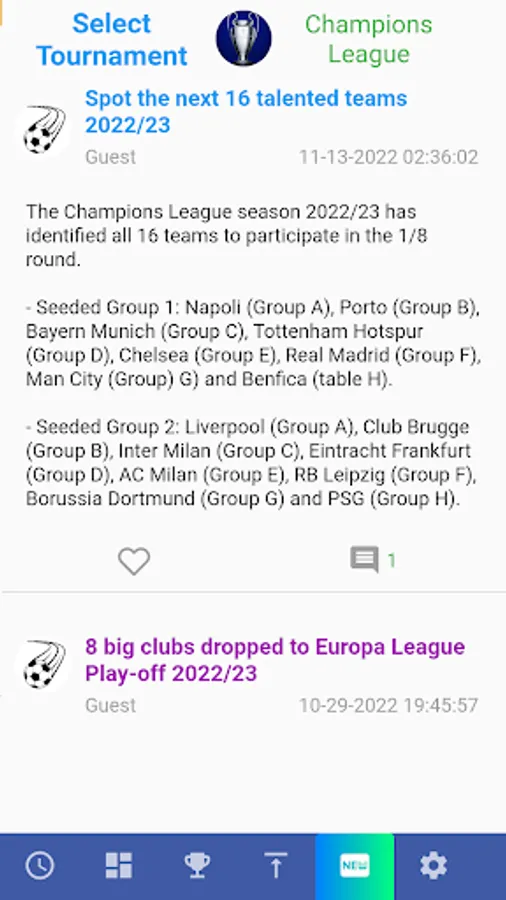 1. Select Tournament: World Cup, Champions League, Europa League, FA Cup, League Cup, Premier League, etc