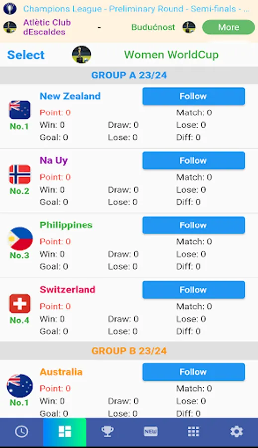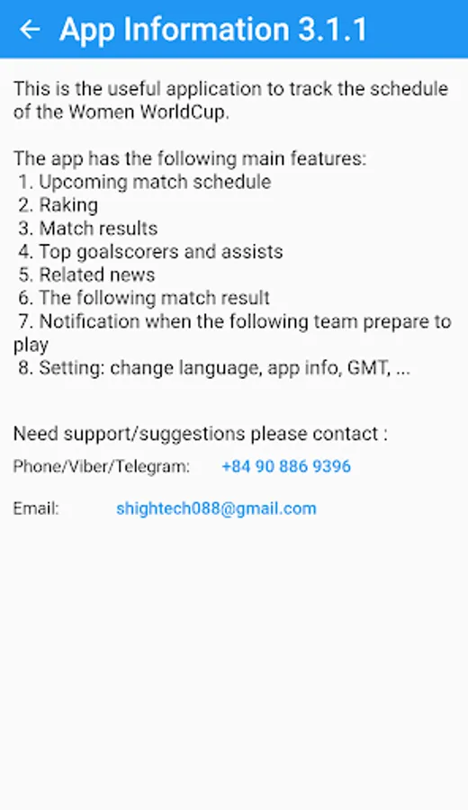 In the application you can find out about the teams participating in the Women World Cup, the tournament groups, the calendar by date and phases and the results.