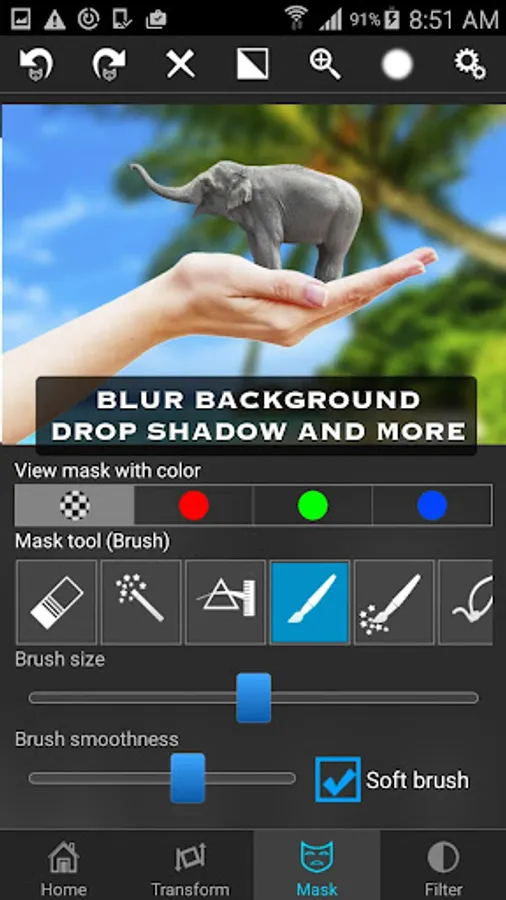 Masking in the app is the most powerful one available on the app store, just tap on an area of the photo, and the app will mask out all the connected area with similar colors. Or you can use brush, lasso, global color similarity, rectangle, ellipse, linear, bi-linear or radial gradient masking tools. Mask a portion with this tool and that portion of the foreground image will become transparent and reveal the background.