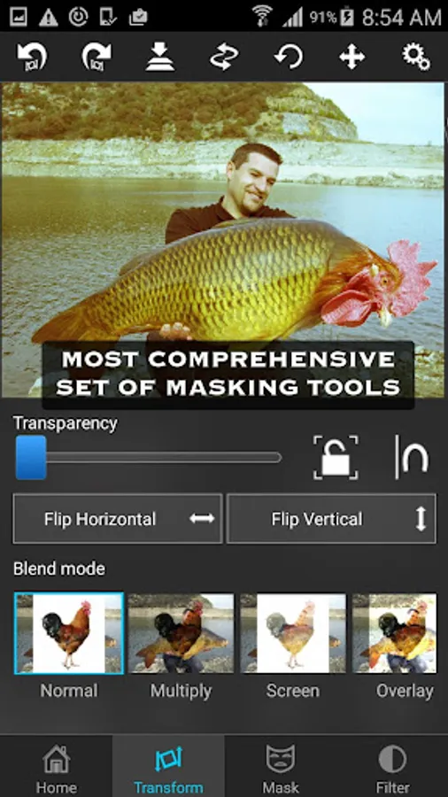 You can also use this tool to do serious photo editing tasks like blending textures or overlaying borders or to do double exposure with adjustable transparency and 18 blending modes.