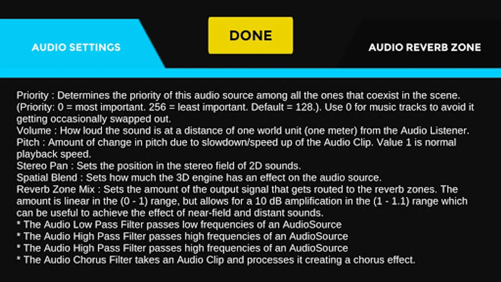 Spatial Blend : Sets how much the 3D engine has an effect on the audio source.