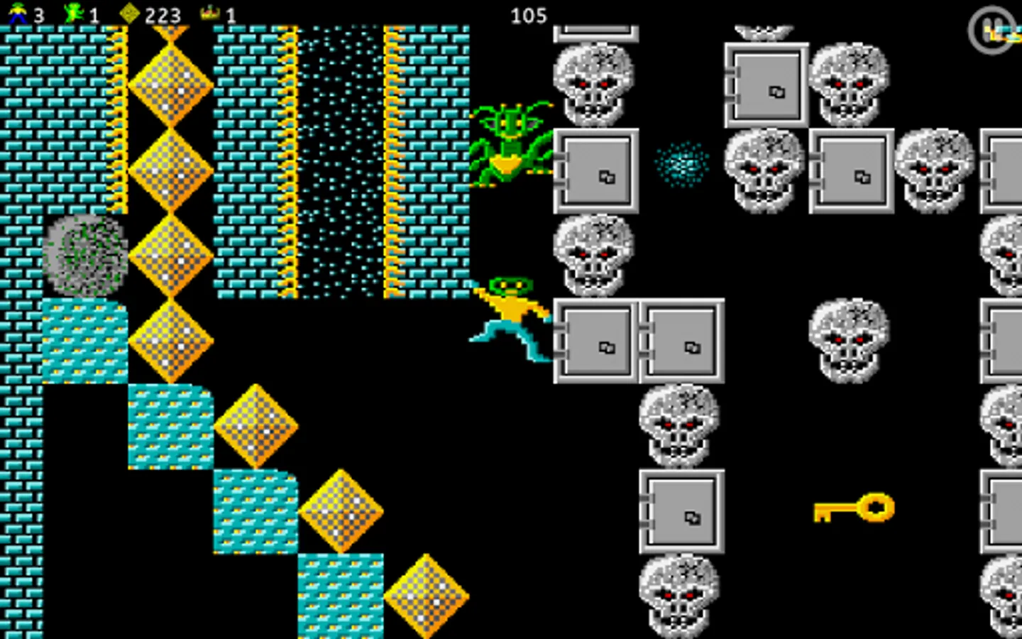 Repton 3 takes the popular Repton 1 idea of level-by-level play, adds most of the extra Repton 2 characters, and brings in time capsules, fungus and crowns. The time capsules allow for some cunning time-based puzzles, while the fungus is also a time-related feature – it's often wise to block it in before it spreads wild.