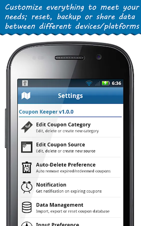 * Import/Export coupon data to backup or just keep multiple devices data in sync (Full version required);