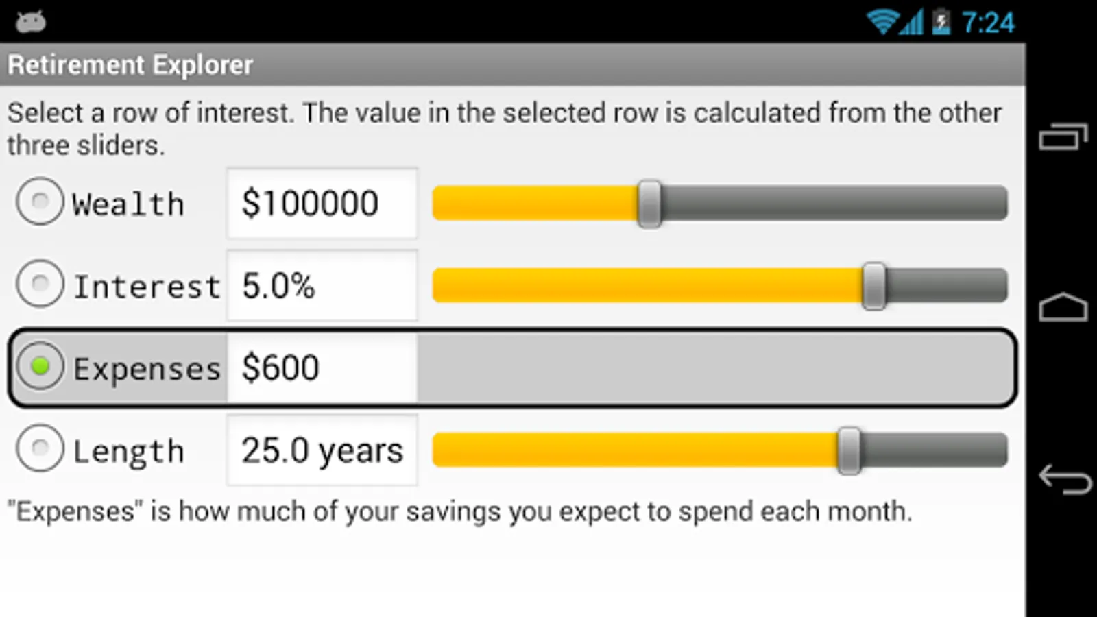 The selected row is the variable the applet is solving for. By default the "Expenses" variable is selected. This means that you can see how much you can draw each month depending on the values you enter for the other three. For example, if you expect a 25 year retirement and expect to earn 5%, you can input those values and then adjust the "Wealth" slider to see how much money you will be able to live on each month depending on your net wealth at retirement.
