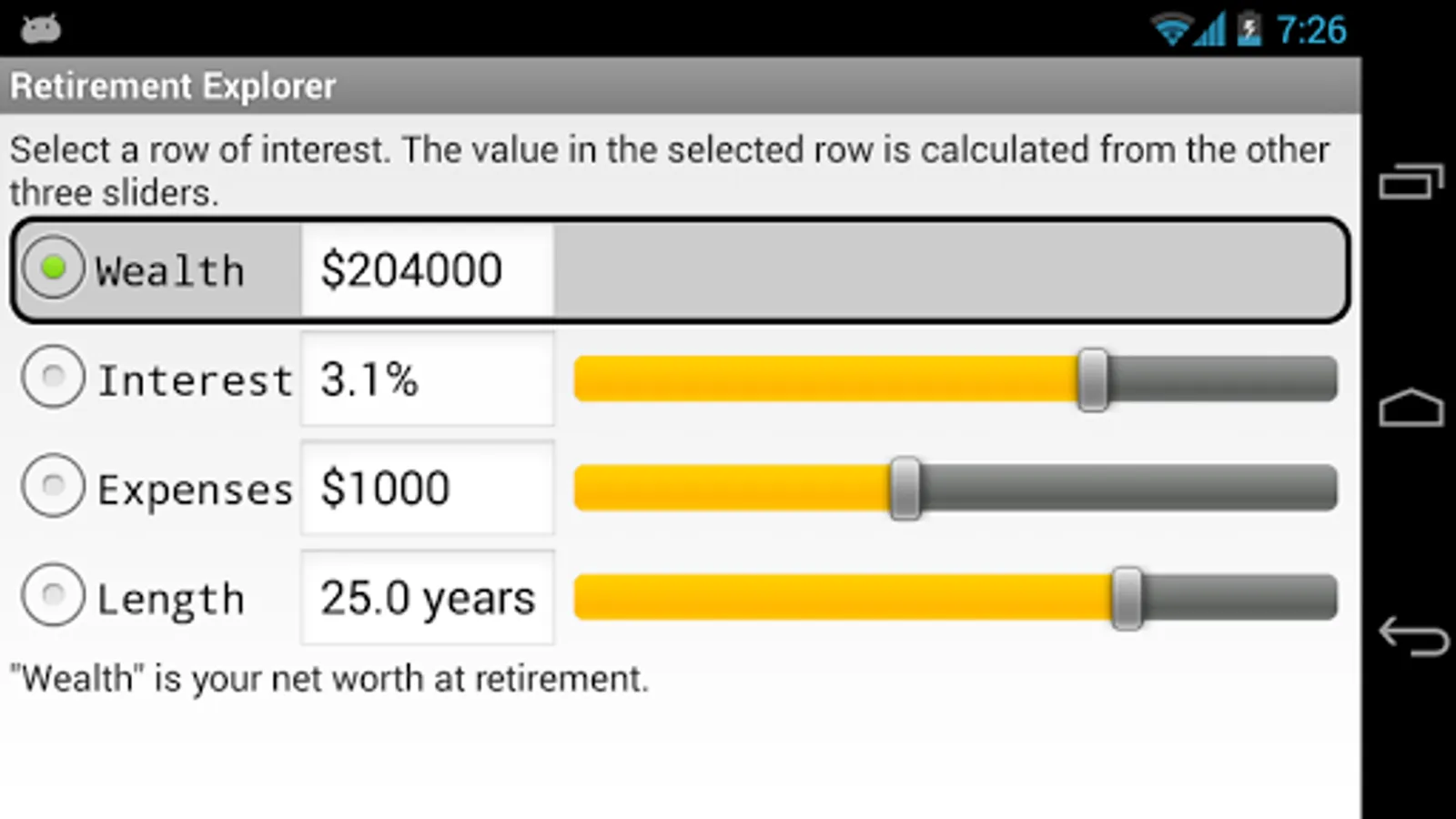 You can select the "Wealth" row in order to see how much you'll need to save in order to retire with a particular desired monthly disbursement. You can solve for "Interest" to see what sort of interest rate you'll to meet your goals, and you can solve for "Length" to see how many years your savings will last given the other parameters. Play with the app for a while and you should get the idea of how to answer many other interesting "what if" scenarios.