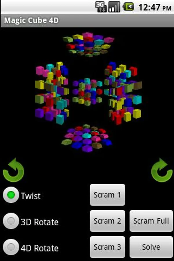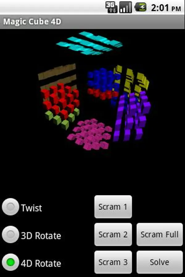 MC4D is a true analog of Rubik's Cube in four dimensions. Tap a hyper-face (a 3x3x3 block of hyper stickers) to rotate that face to the center. Use the buttons to scramble 1, 2, or 3 random twists and then try to undo those twists back to the solved state. Or hit the "Solve" menu item and watch the app do it.