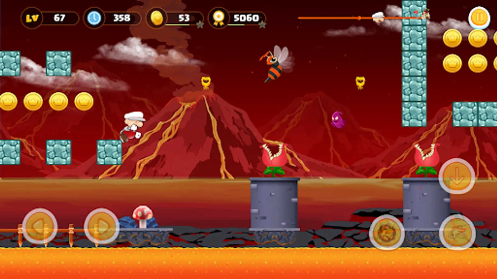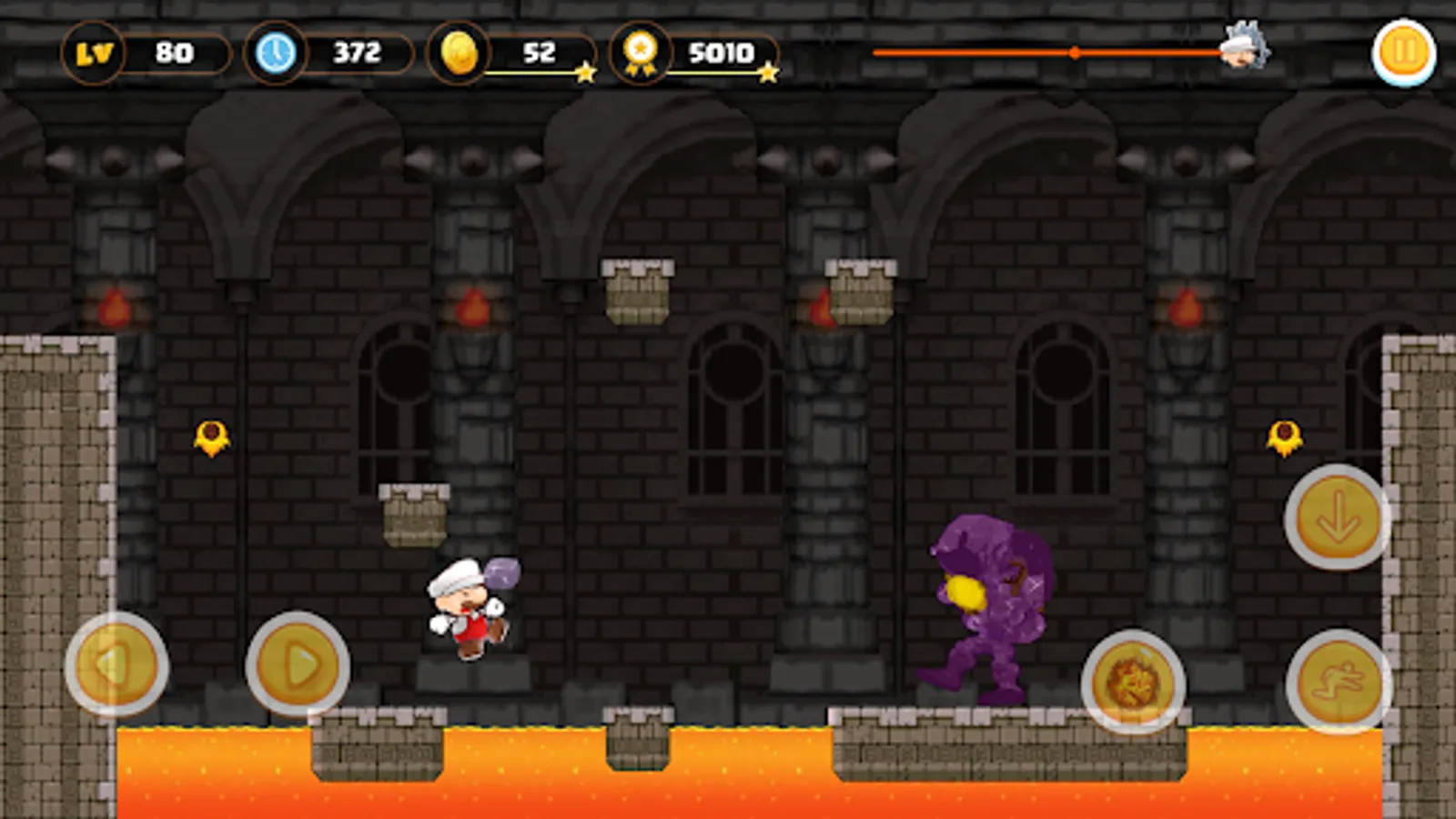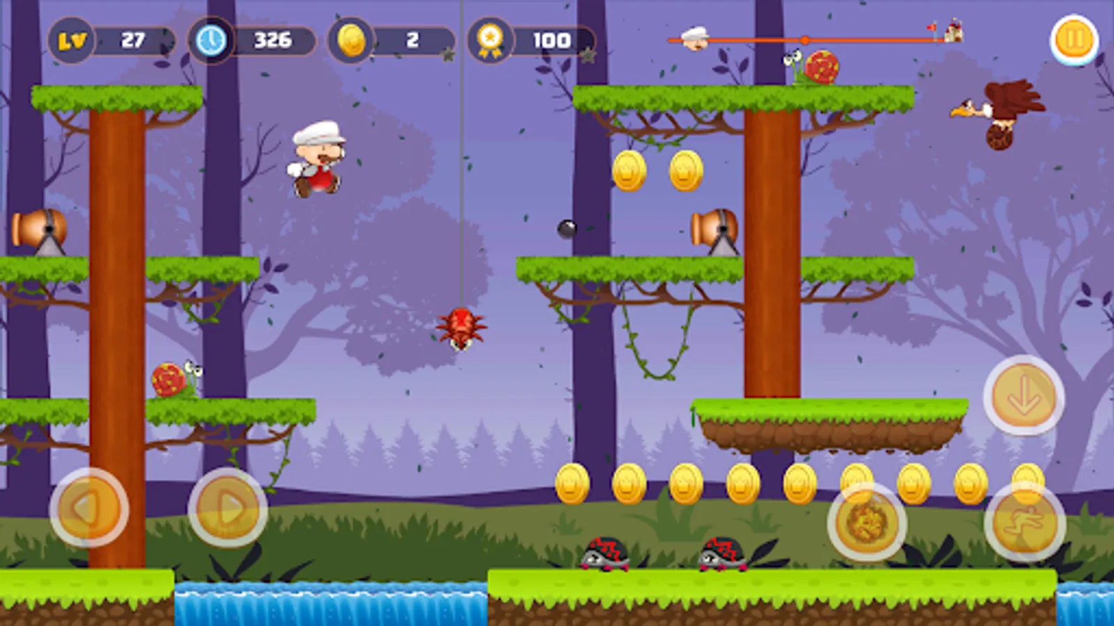 Run, jump and smash through the deep jungle, obstacle course, avoid traps, collect treasure and defeating the monsters to rescue his friend.