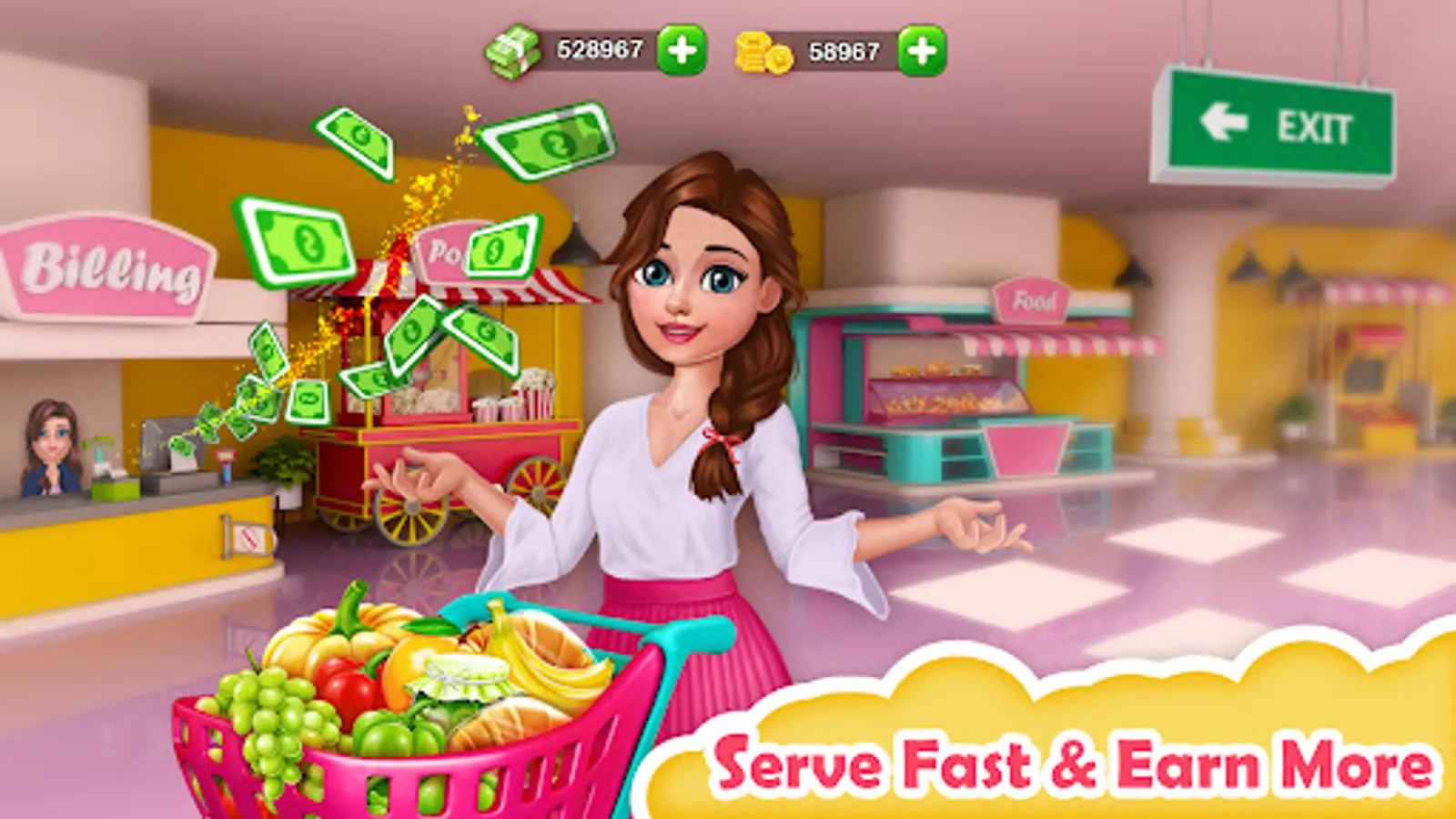 Take care of your customer. Serve customers on time and earn money, customers will leave your supermarket if they do not get an item on time. Earn cash and coins to upgrade your store capacity and serve fast. We have a lucky spin wheel to get exciting rewards in the game. Lots of attractive stores are available as an upgrade option.Be on top rank cashier in leaderboard.