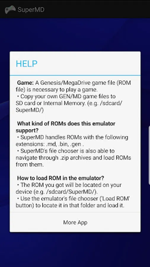 - Copy your own MegaDrive/Genesis game files to SD card or Internal Memory. (e.g. /sdcard/SuperMD/)