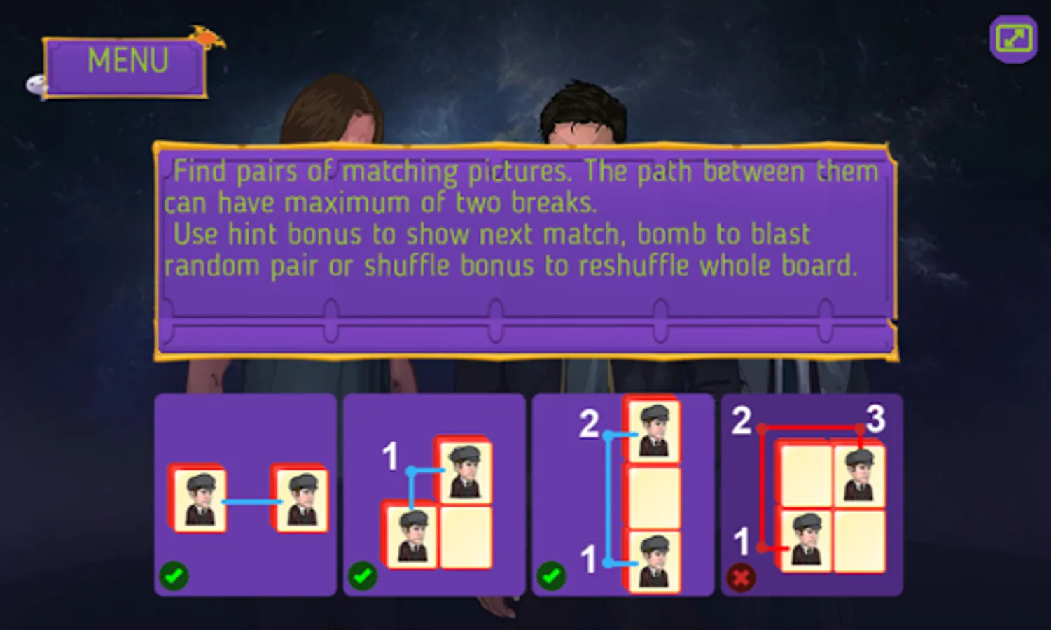 This mahjong game have simple rule, two tiles can be connected if path between them has maximum of two turns. Your target is to clear whole board and you will