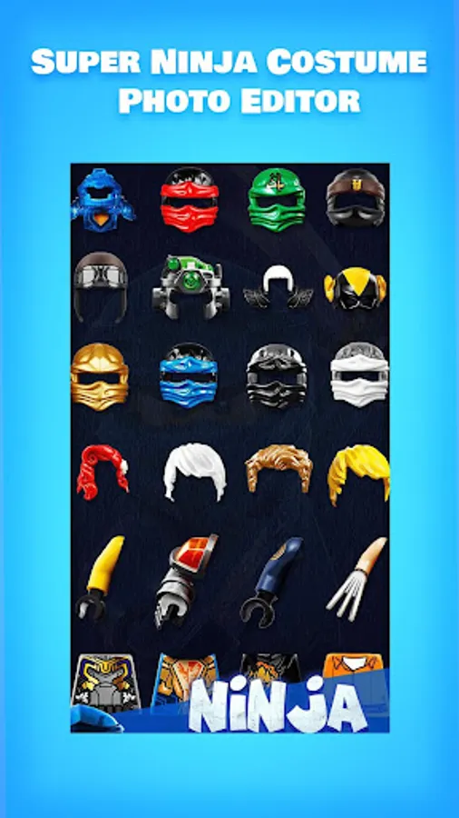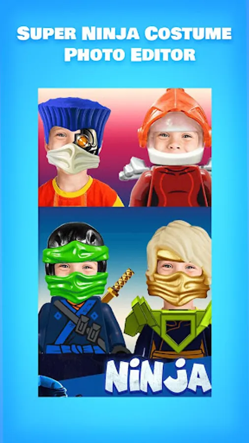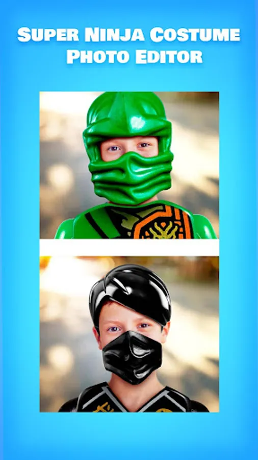 Super Ninja Costume - Construction Toys Camera Photo Editor is a great ''photo suit'' app that you need to see and try out! Download this lego ninjago photo editor and have one of the most original ''photo montage'' maker! You can even design and create your own superhero suit with the help of the lego pieces this ninja mask face changer contains! Save your new ''ninja'' photo on your phone, send it to friends or share on social networks!