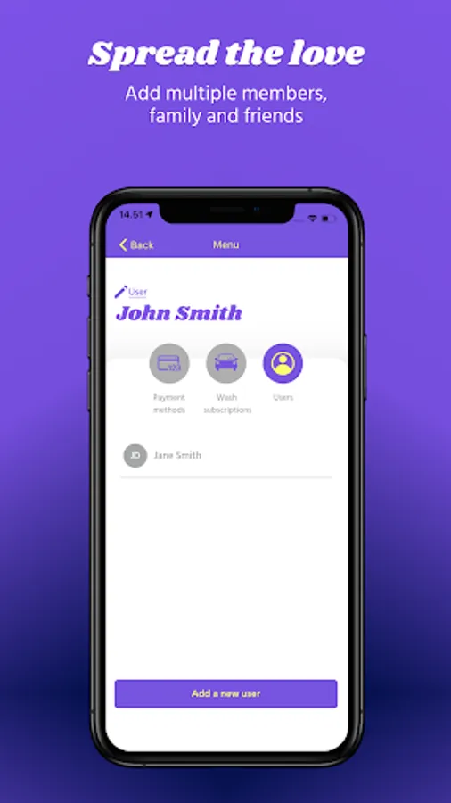 - Pay for individual washes in app through credit or debit card