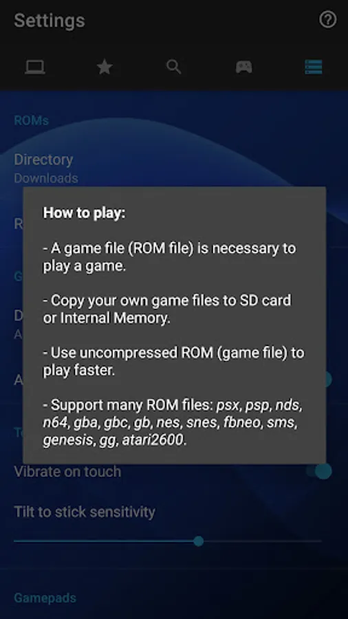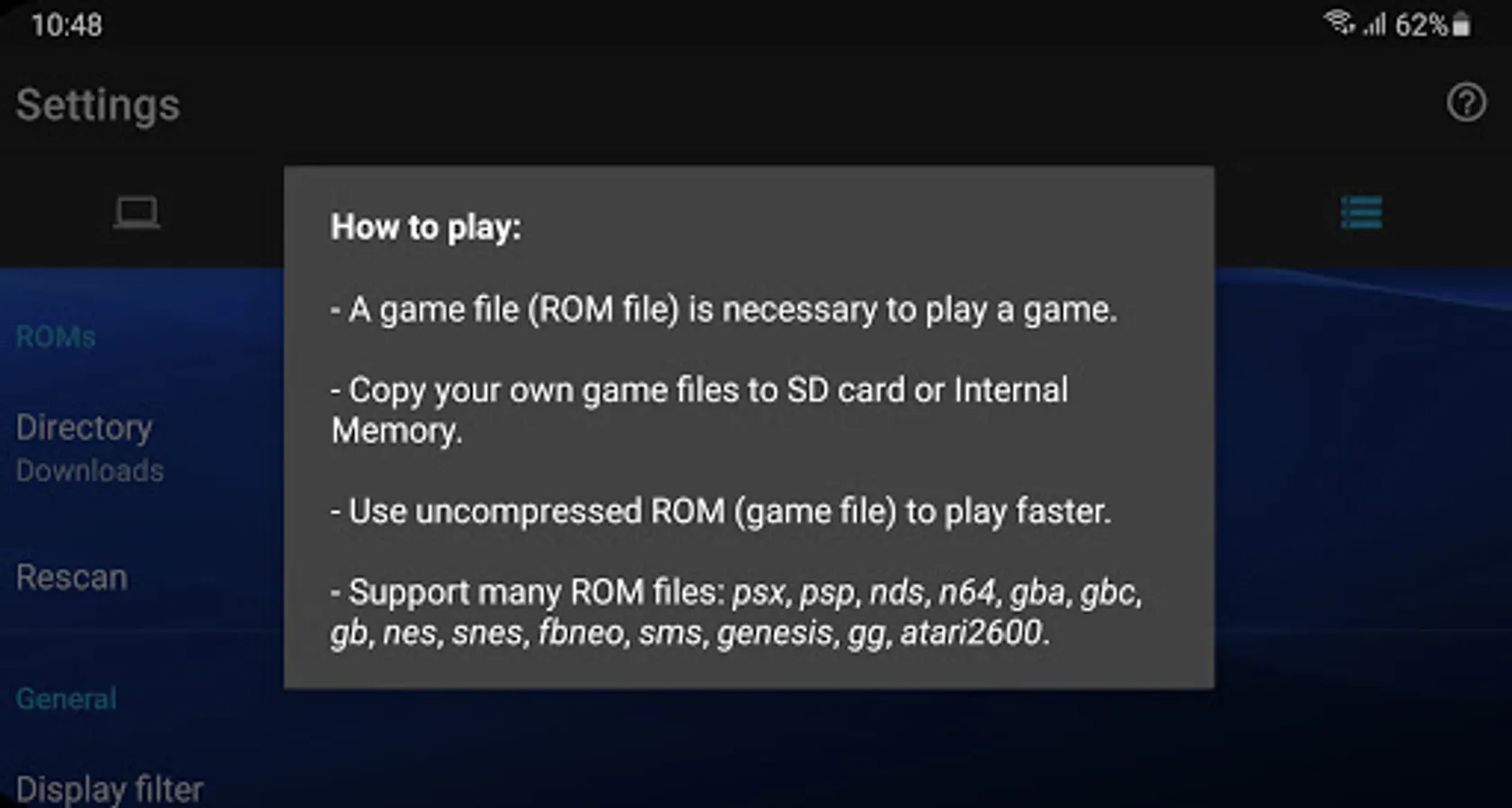 - Copy your own game files to SD card or Internal Memory.